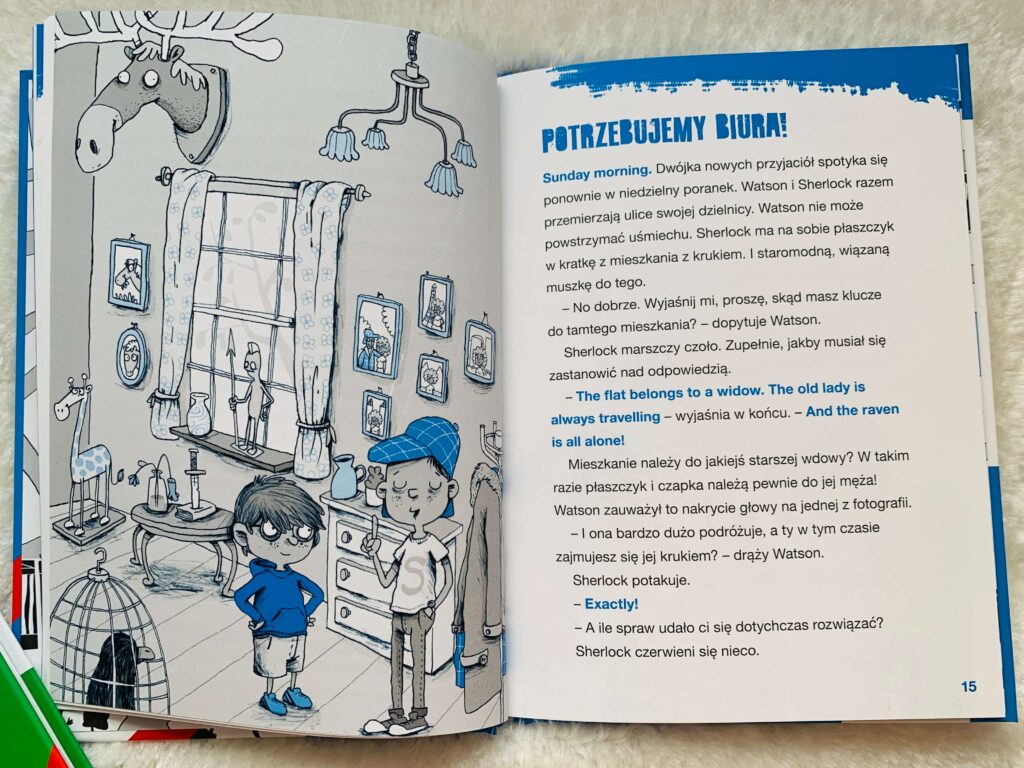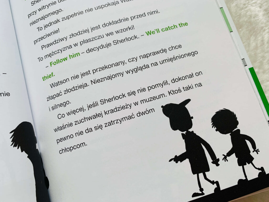 Nowa seria detektywistyczna dla starszych dzieci (6-10 lat) do nauki języka angielskiego. W wyjątkowy sposób! Angielskie zwroty są tak umiejętnie wplecione w tekst, że dziecko uczy się ich intuicyjnie i rozumie z kontekstu znaczenie. Na końcu książki jest też słowniczek wszystkich wprowadzonych w danym tomie zwrotów – jest ich naprawdę dużo!