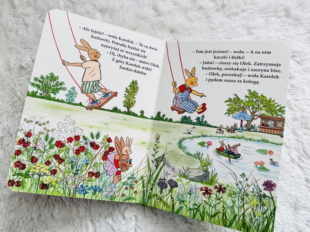 Pozostając w świecie mieszkańców ulicy Czereśniowej, chciałam Wam też polecić serię o króliku Karolku. Znajdziemy tu ten sam pozytywny klimat, przepiękne ilustracje, a także mądrą i zabawną treść. Każda książka to inna przygoda niesfornego króliczka. Karolek chodzi do przedszkola, lubi bawić się na dworze ze swoim starszym przyjacielem Olkiem, jeździć na rowerze z tatą po zakupy, pokazywać świat swojej młodszej siostrzyczce. Każdy dzień to też okazja do nowych psot, a Karolek, jak na rezolutnego królika przystało, żadnej nie przepuści!