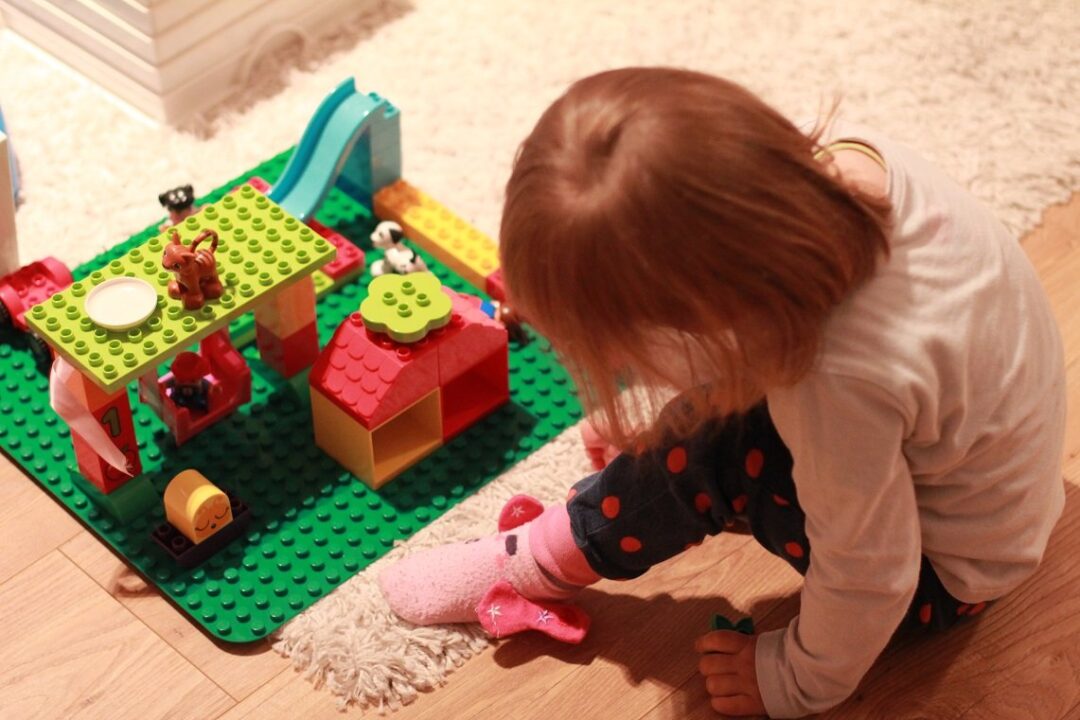Pierwsze dni choroby spędził z Tosią tata. Gdy wróciłam z pracy i zobaczyłam, co zrobił dla swojej ukochanej córeczki, wzruszyłam się do łez. Tosia bardzo chciała iść na plac zabaw, wyciągnęła buciki, próbowała sobie założyć i siadała pod drzwiami. Tatuś cały świat by przychylił swojej córeczce, więc co to dla niego plac zabaw? Zbudował go z klocków Lego! Były 2 huśtawki, piaskownica i zjeżdżalnia. Tosia pokochała tę zabawę! Do tej pory przy każdej zabawie Duplo obowiązkowo musimy budować plac zabaw :)