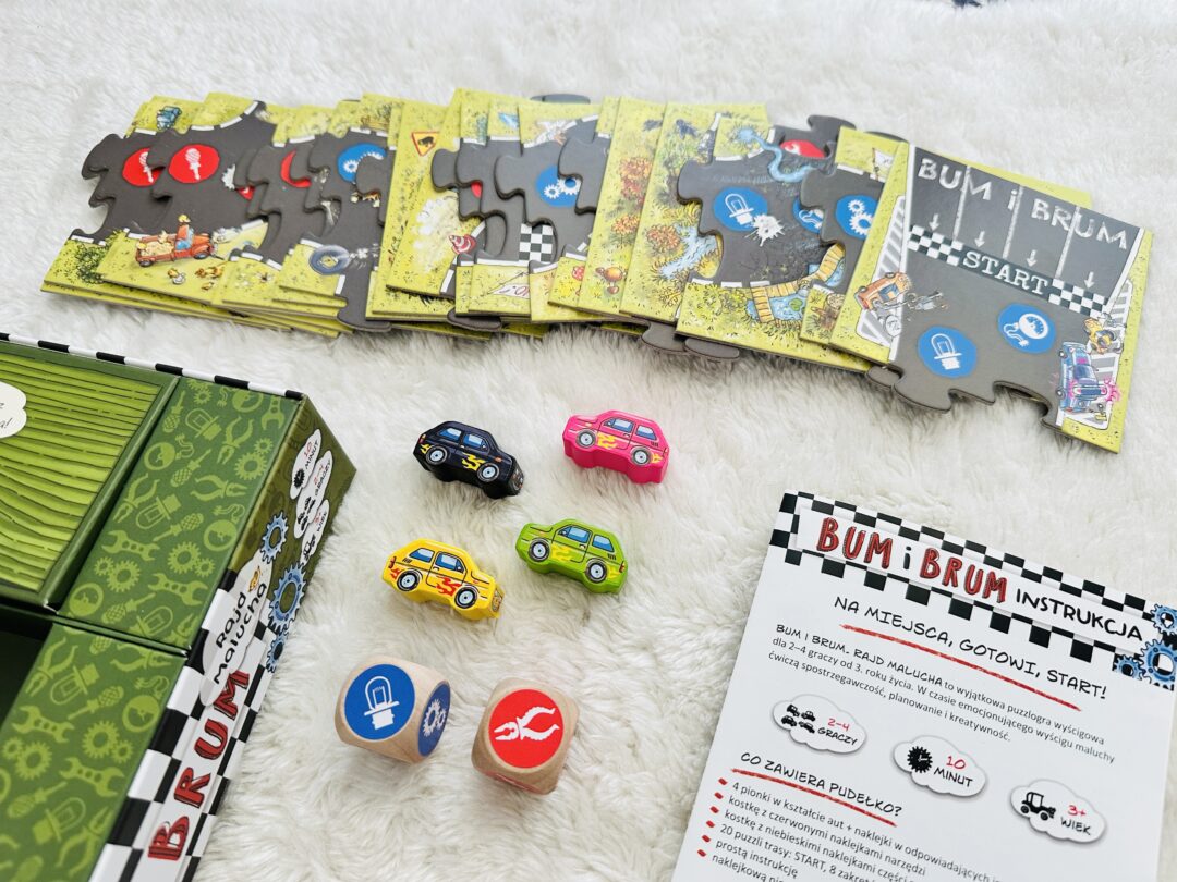 Bardzo fajna gra dla najmłodszych. W pudełku znajdziemy drewniane autka-pionki, kostki, instrukcję oraz grube, tekturowe puzzle, z których budujemy trasę wyścigu. Gracze naprzemiennie rzucają wybraną kostką i starają się dotrzeć jak najszybciej do mety. Co ciekawe, każdy rzut to decyzja – którą kostkę wybrać? Czasem korzystniejsze będzie użycie tej z niebieskimi polami, a czasem z czerwonymi. Dzięki temu dziecko może się zastanowić i tym samym zwiększyć prawdopodobieństwo wygranej. W instrukcji znajdziemy trzy proponowane trasy o różnym stopniu trudności, ale możemy też ułożyć inne wersje według własnego pomysłu. Dzięki temu gra się szybko nie nudzi :)