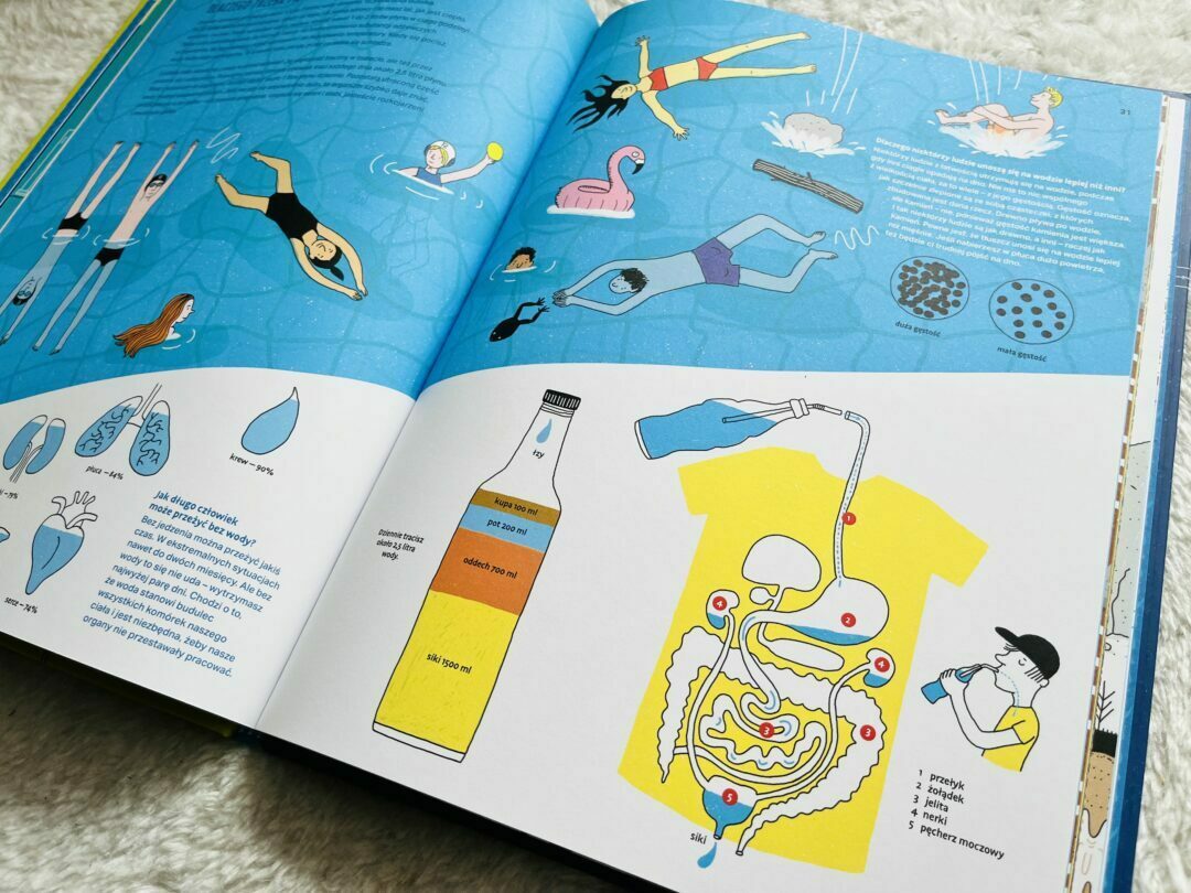 Fantastyczna książka, która wciąga od pierwszej strony. To prawdziwe kompendium wiedzy i ciekawostek o wodzie – znajdziemy tu bardzo szeroki przekrój tematów. Czym jest woda? Jak powstaje woda gruntowa i jak ją znaleźć? Jakie ma znaczenie dla klimatu? Jak pojawia się burza? Dlaczego trzeba pić wodę? I jak trafia do naszego domu? Przyjrzymy się morzom, oceanom i rzekom, zajrzymy do oazy, sprawdzimy jak działają zapory wodne i dowiemy się więcej o katastrofach naturalnych związanych z wodą – tsunami i powodziami.