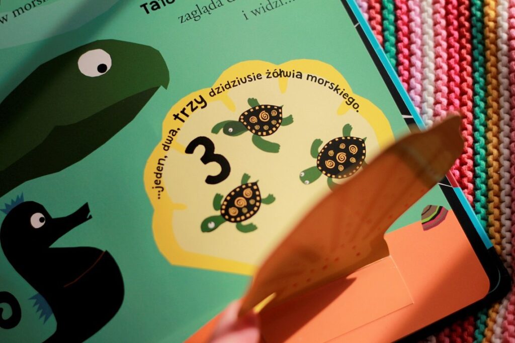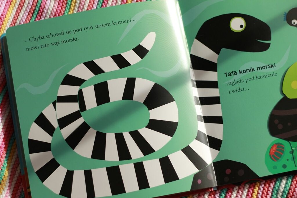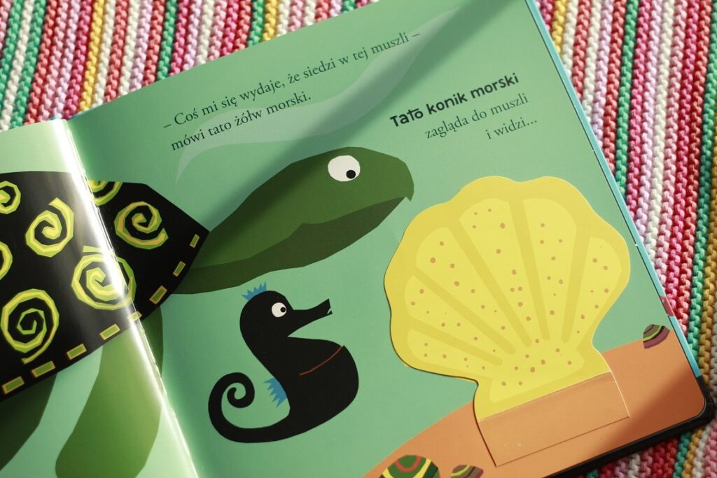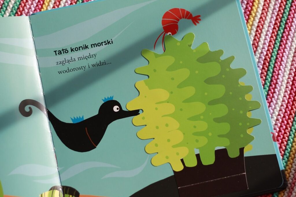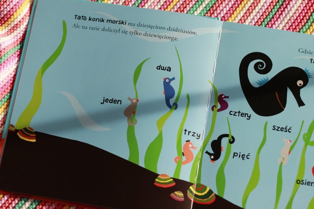 Najlepsza książka jaką znam do nauki liczenia dla dzieci. Powiedzcie sami, czy połączenie cyferek z sympatycznymi morskimi zwierzątkami i okienkami może się nie podobać? Nie ma takiej opcji! „Gdzie jest konik morski?” to przyjemna i wciągająca historia konika morskiego, który ma 10 dzieci, ale gdzieś mu się to dziesiąte zapodziało… Tacie konikowi morskiemu w poszukiwaniach pomagają morscy sąsiedzi oraz nasze dziecko, które na każdej karcie odkrywa okienko i liczy, liczy, liczy… Cała koncepcja tej książki, piękne, kolorowe ilustracje oraz pełne humoru zakończenie sprawia, że naprawdę nie mam problemu z tym, że książkę tę czytamy z Tosią zwykle 3-4 razy pod rząd :) Codziennie.