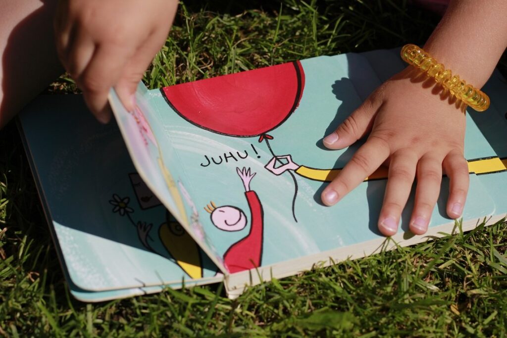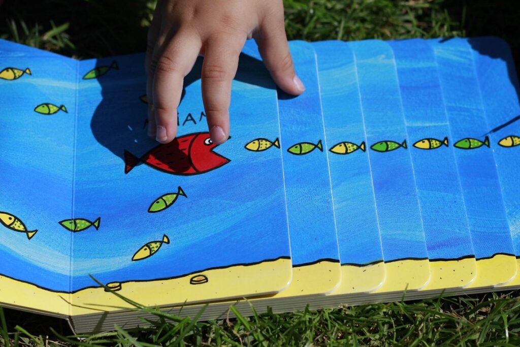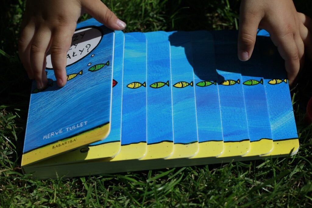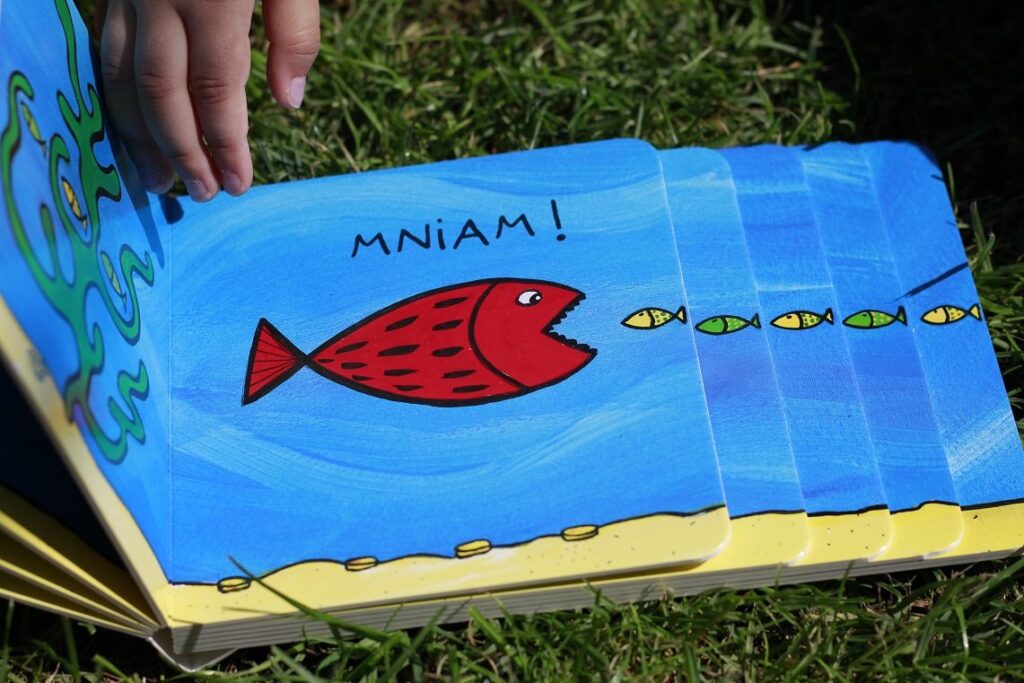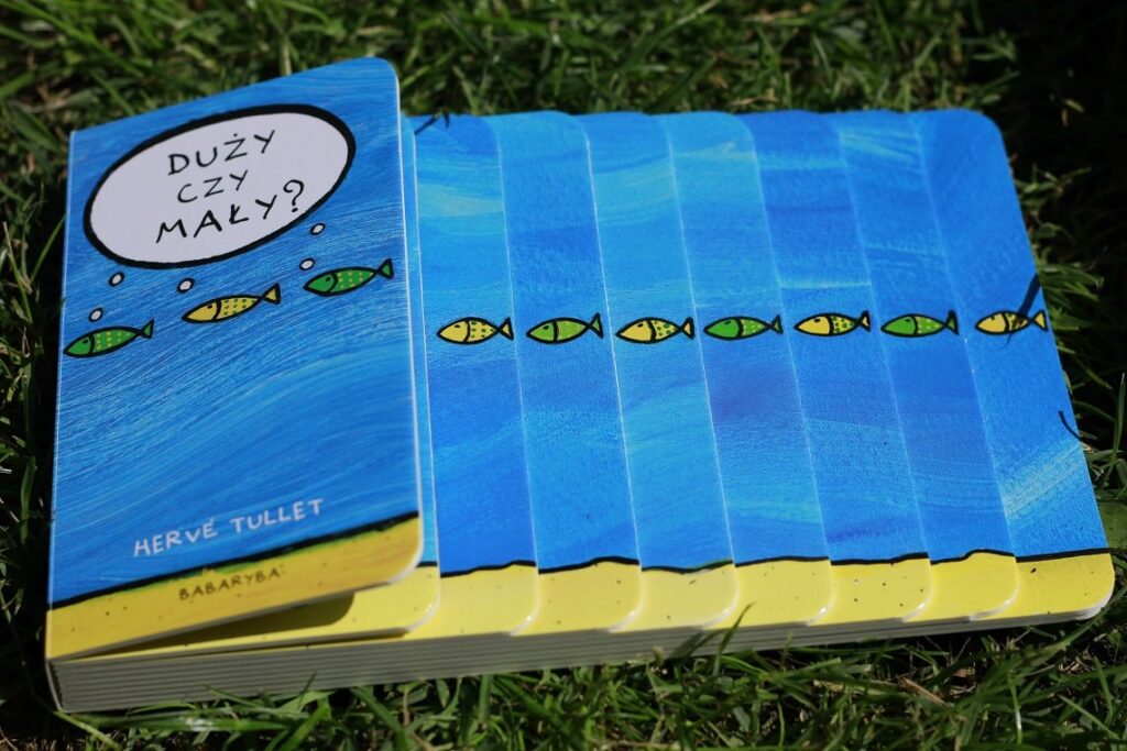 „Duży czy mały?” można przeglądać na wiele sposobów. Wraz z Tosią porównujemy wielkość rybek, przekonując się, że jedna i ta sama może być raz większa, a raz mniejsza. Szukamy też skarbów na dnie morza i opowiadamy historyjki o celu podróży czerwonej rybki.