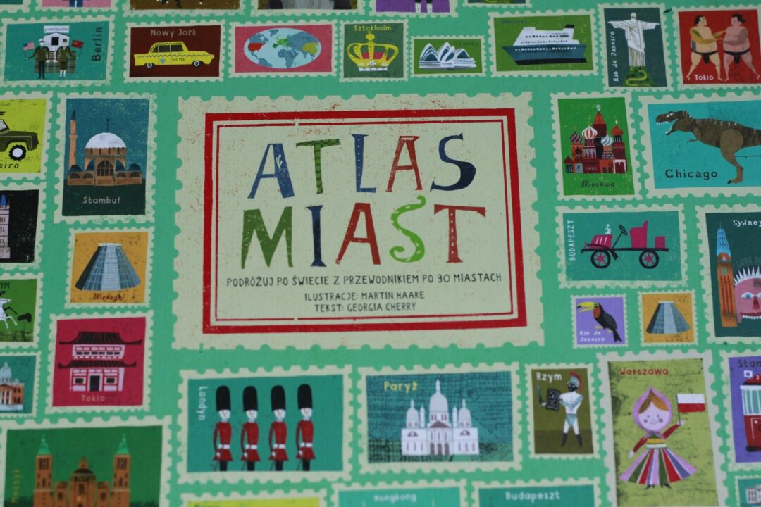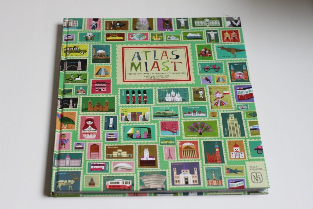 Atlas Miast M. Haake i G. Cherry zamówiłam dla Tosi, jednak korzystamy z niego wspólnie i nierzadko przeglądam go nawet gdy już dziecko smacznie śpi. To świetny sposób na zapoznanie dziecka (i siebie :) ) z najważniejszymi atrakcjami europejskich i światowych miast, najciekawszymi miejscami, zwyczajami i zwierzętami. Wszystko podane w pięknej, nowoczesnej formie.