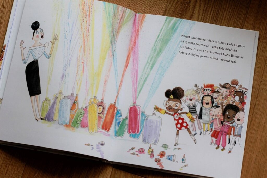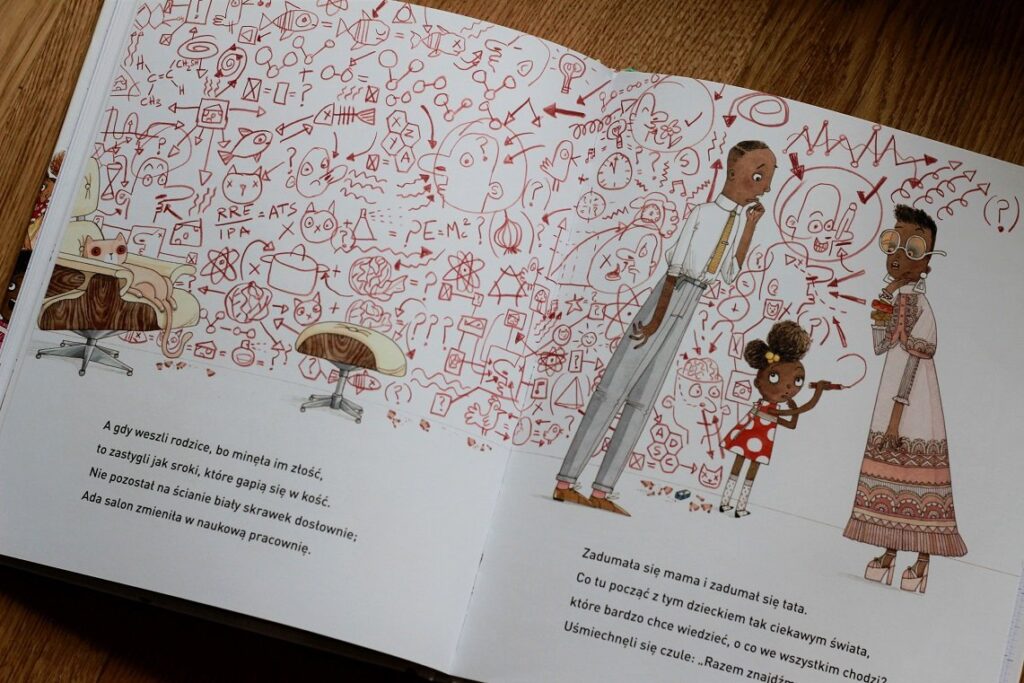 „Ada Bambini, naukowczyni” to historia dziewczynki, która chce wiedzieć więcej i więcej, zadaje mnóstwo pytań, główkuje, stara się znaleźć odpowiedzi, nie odpuszcza. Czasem to kombinowanie wymyka się spod kontroli (a może by tak wyprać kota w pralce?), ale wtedy mądrze interweniują jej rodzice. Co prawda nie do końca rozumieją pasję dziewczynki, ale starają się ją wspierać najlepiej jak potrafią. Wyznaczają bezpieczne granice dla eksperymentów córki, ale dają jej też dużo swobody, zachęcają do poszukiwań. Poświęcają nawet białe ściany w salonie :) Mała naukowczyni musi przecież mieć swoją pracownię!