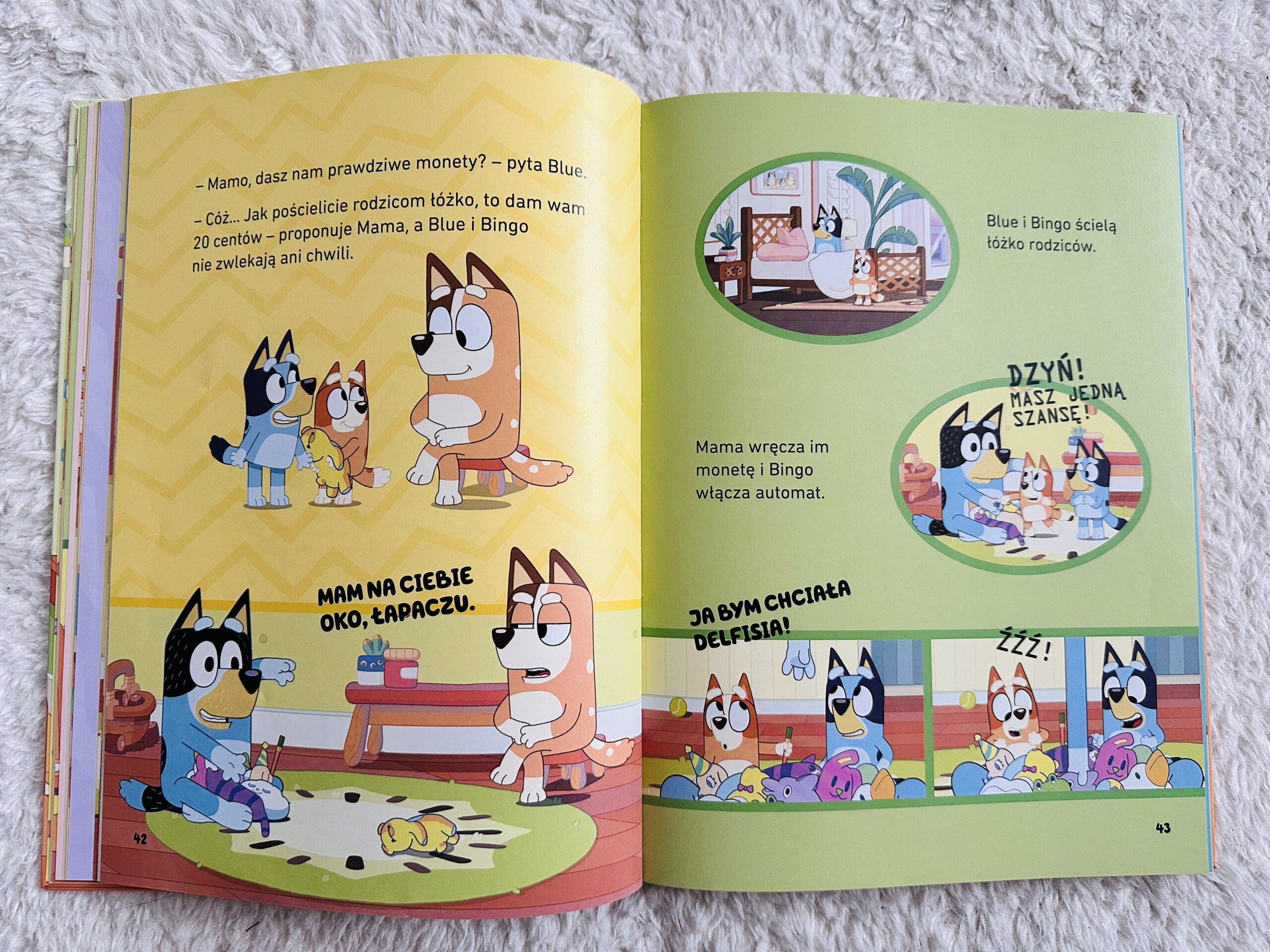 - „Bluey. Oto Bluey!” – zeszyt z zadaniami i naklejkami dla dzieci w wieku przedszkolnym, w tym: labirynty, wyszukiwanki, różnice, naklejanie naklejek i sporo ciekawostek ze świata Blue i Bingo