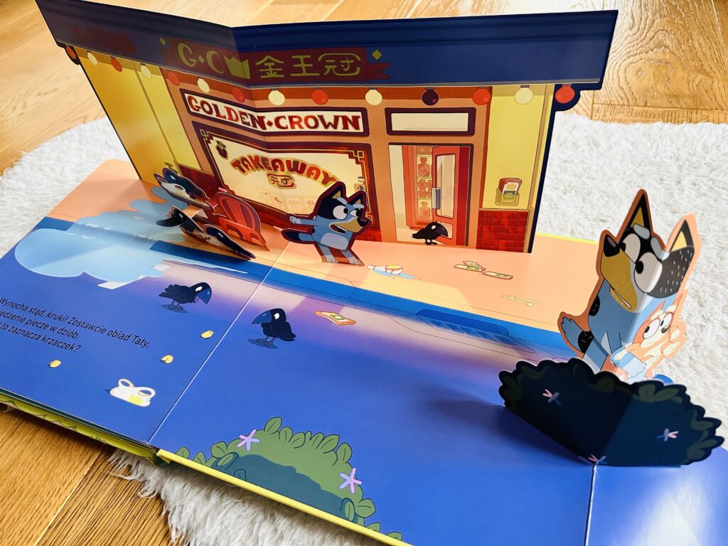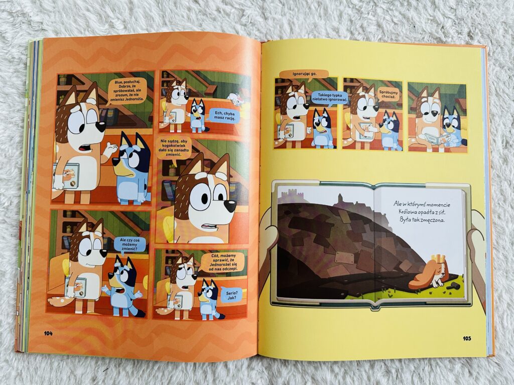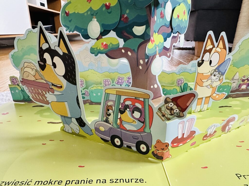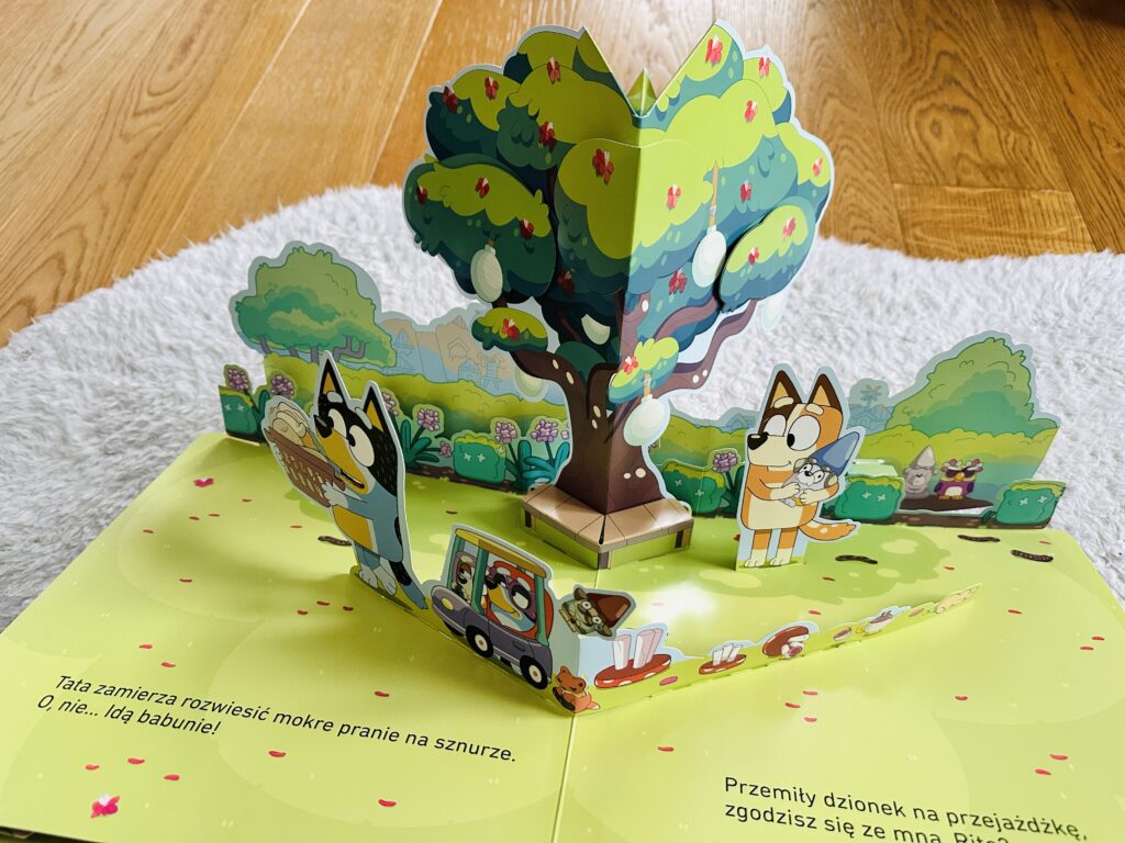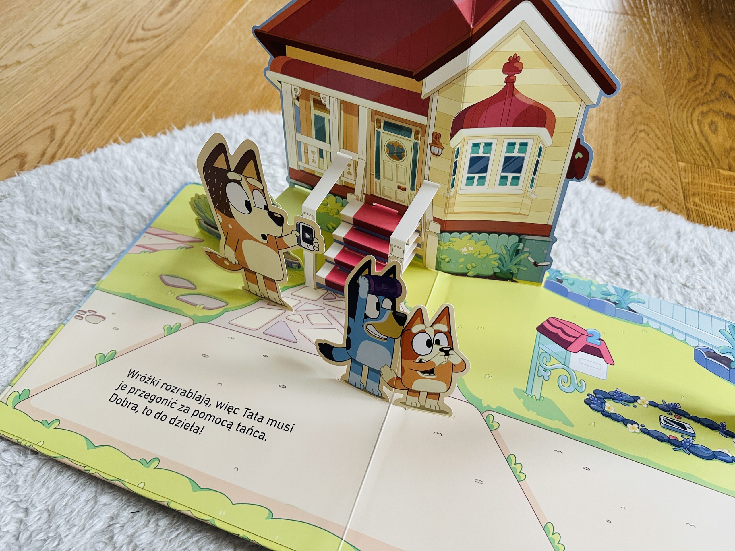 Niesamowita książka z efektem wow! Idealna na prezent i dla największych miłośników Bluey – takich jak my :) Przepiękne wykonanie, duży format i przypomnienie najciekawszych chwil z życia rodziny Łączków, momentów, które zapadły nam szczególnie w pamięć z odcinków bajki. Pamiętacie rozrabiające wróżki, które można przepędzić tylko za pomocą tańca? Zabawę w babunie? Wyprawę nad strumyk? Dzięki tym świetnym „makietom” szybko przeniesiemy się do tych chwil i przeżyjemy jeszcze raz przygody Blue i Bingo. I na koniec ważna informacja. Tekstu jest tu bardzo mało, książkę polecam więc przede wszystkim małym (i większym) fanom, którzy świetnie znają bajkę Bluey – super się nada do opowiadania!
