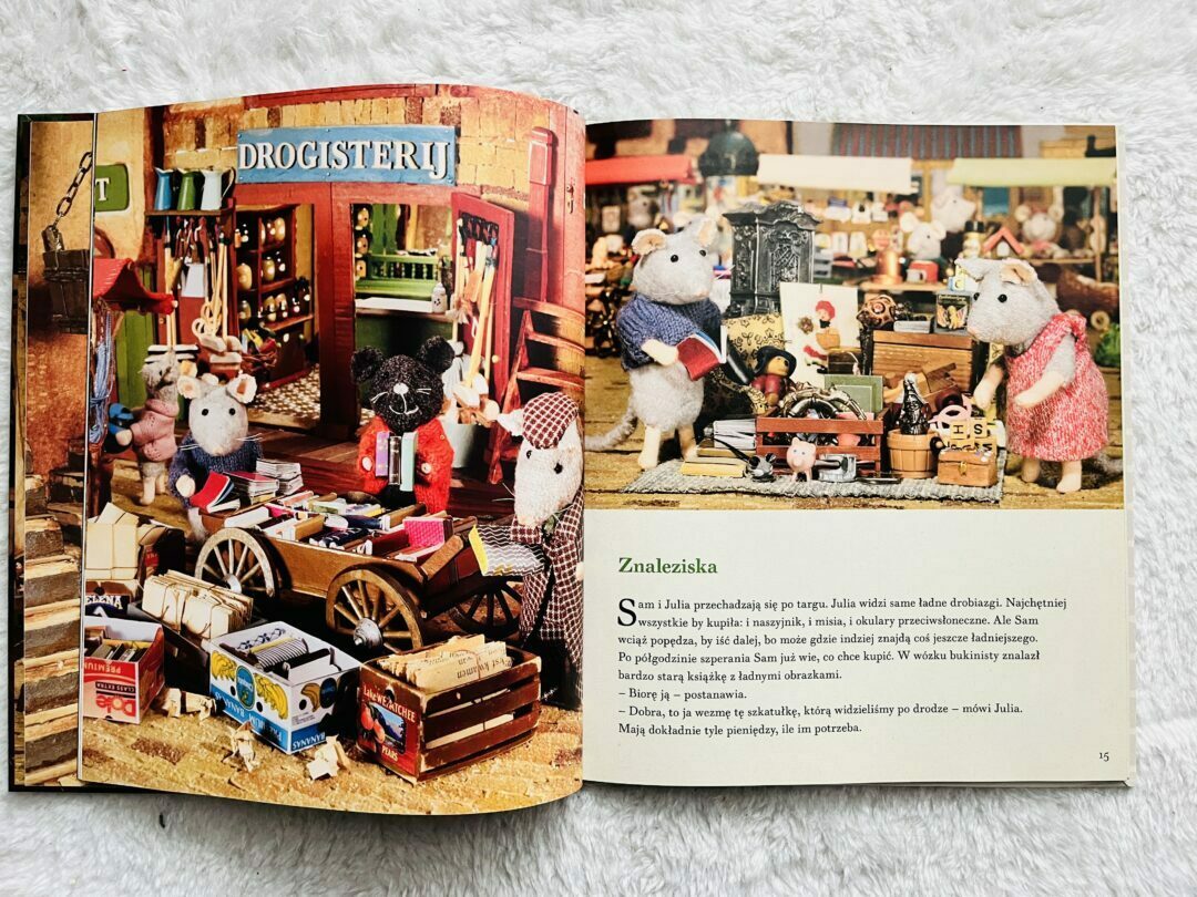 Wspaniała seria książek dla przedszkolaków, którą polecałam już kilka razy. Tym razem pokażę Wam część z opowiadaniami o nowych przygodach Sama i Julii, dwóch myszek, które mieszkają w wyjątkowym domku. Warto wiedzieć, że w książce są zdjęcia, a nie grafiki, bo Mysi domek naprawdę istnieje. To niesamowity projekt, dom i wiele innych przestrzeni zbudowanych z kartonowych pudeł, papier marche i mnóstwa przeróżnych dodatków. Sympatyczne myszki w tej części wybiorą się na targ staroci i wybiorą dla siebie kilka skarbów, a potem odwiedzą muzeum i poznają zupełnie nowy świat…