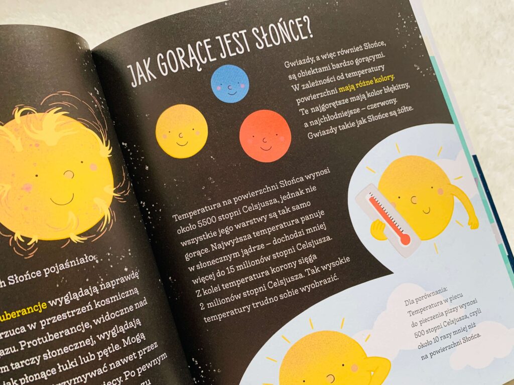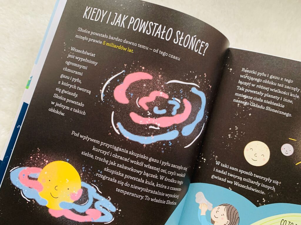 Must have dla wszystkich fanów tematyki Kosmosu. Tę książkę polecałam we wpisie o najlepszych zabawkach i książkach dla dzieci. Kiedy i jak powstało Słońce? Co to jest wiatr słoneczny? Jak działa zegar słoneczny? Co to jest ozon? Jak powstaje zorza polarna? Jak gorące jest Słońce? Ile gwiazd jest na niebie? Dlaczego Księżyc zmienia kształt? Skąd się bierze tęcza? Na czym polegają dni i noce polarne? Dzieci dowiedzą się mnóstwa ciekawych rzeczy o Układzie Słonecznym, sondach kosmicznych i różnych zjawiskach obecnych we Wszechświecie.