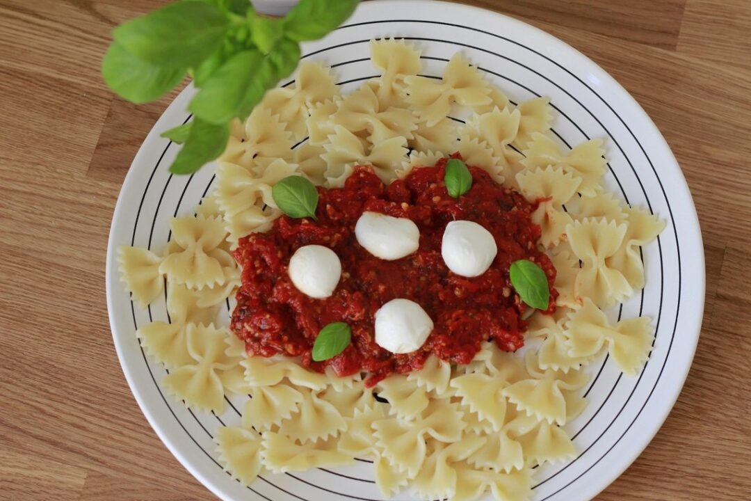 Na talerz wykładamy w kolejności: makaron, sos, kulki mozarelli. Dla efektu dekorujemy listkami bazylii :)
