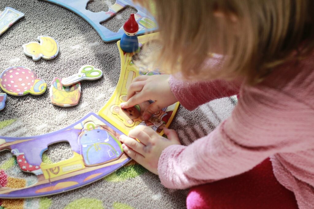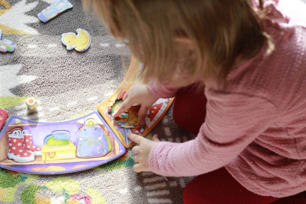To nasz obecny hit hitów i must have wyjazdów do dziadków. To jest w zasadzie taki wstęp do przygody z planszówkami – połączenie gry i puzzli. Tosia bardzo lubi w nią grać, dla nas też jest to przyjemny czas. Uwielbiam patrzeć jak „czyta” instrukcję i opowiada o zasadach rozgrywki. A są one oczywiście proste. Celem gry jest pomoc Tomciowi w uporządkowaniu mieszkania. Gra składa się z dużych solidnych elementów, są to pokoje lub strefy oraz mniejszych części – przedmiotów. Do tego mamy drewnianą figurkę Tomcia, kostkę i 6 żetonów.