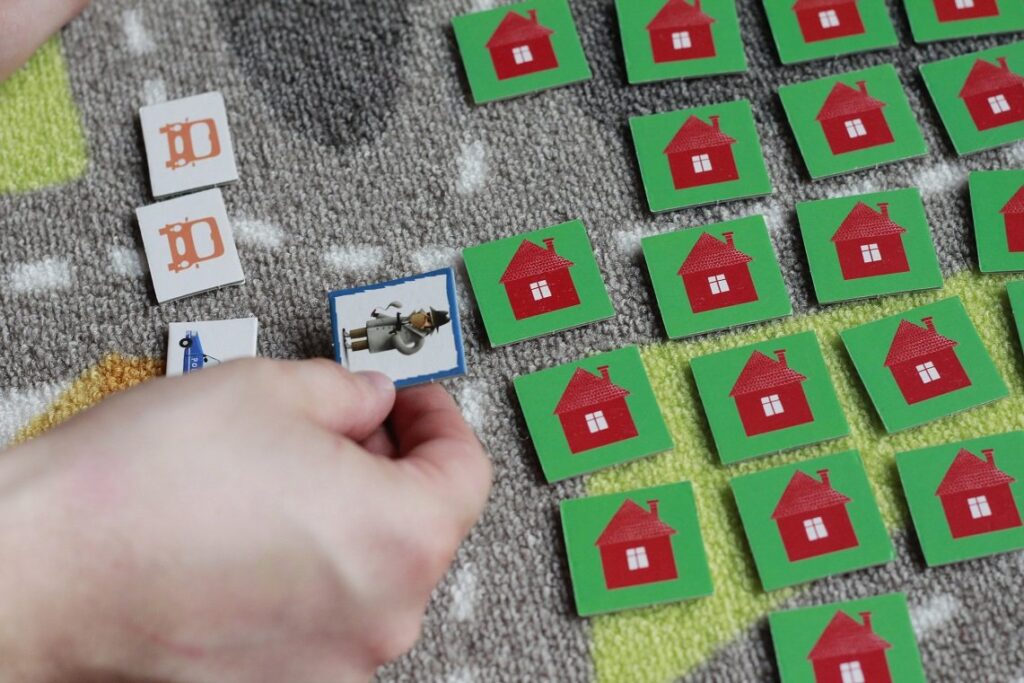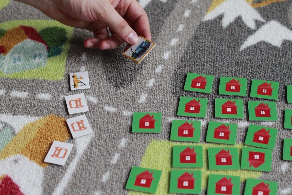 Na początku rozkładamy wszystkie zdarzenia obrazkiem do dołu i rozdajemy każdemu graczowi zestaw pojazdów ratunkowych, które też mają leżeć zakryte. Dziecko najpierw odkrywa jeden z pojazdów, a potem zdarzenie. Jeśli pasują, maluch zatrzymuje kafelek zdarzenia i gra dalej.
