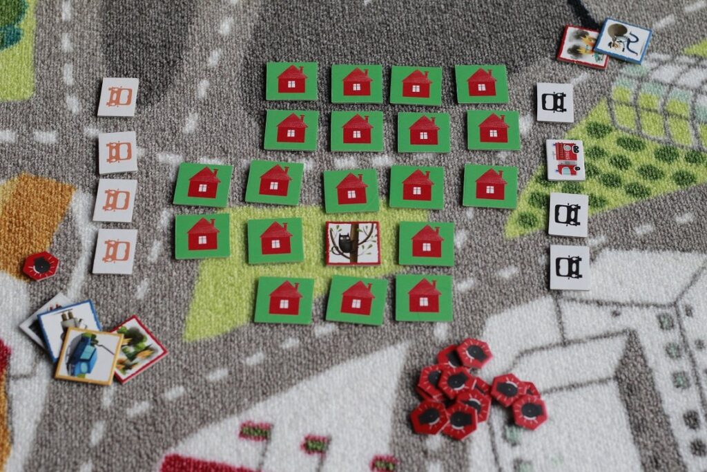Teoretycznie najtrudniejsza gra z tego zestawienia moim zdaniem jest idealna dla trzylatków, choć oczywiście wymaga skupienia. W zestawie znajdują się: kwadraciki z różnymi zdarzeniami, prostokąciki z pojazdami ratunkowymi (straż pożarna, karetka, policja i pomoc drogowa), żetony alarmowe i znaczniki zakazu (z nich na razie nie korzystamy, bo utrudniają rozgrywkę).