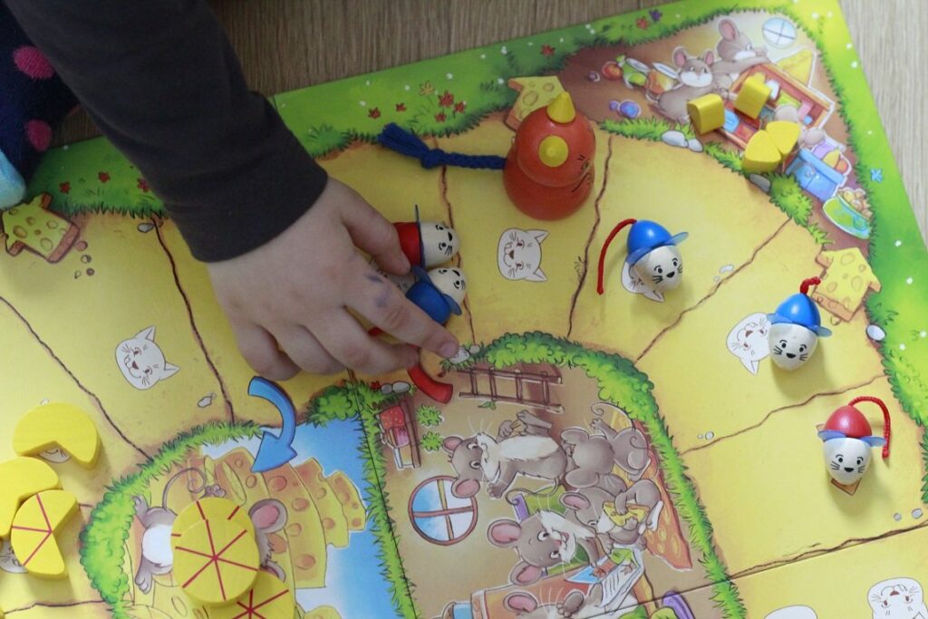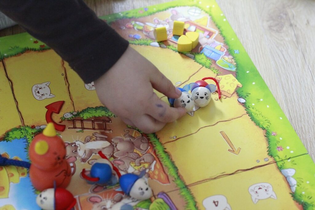 Trochę trudniejsza i bardziej skomplikowana gra, a zarazem klasyczna planszówka. Polega na uciekaniu małymi myszkami przed dużym kotem, który chce je zjeść. Co jakiś czas myszki mają możliwość schronienia się w norce i schrupania kawałka sera. Im jednak bliżej mety tym nagroda, czyli kawałek sera, większa. Gra uczy podejmowania decyzji – idziesz dalej, czy chowasz się w norce? którą myszką się ruszysz? To też świetny sposób na przetrenowanie stresujących momentów i małych przegranych, gdy kot „zjada” myszkę. No i oczywiście rywalizacja.