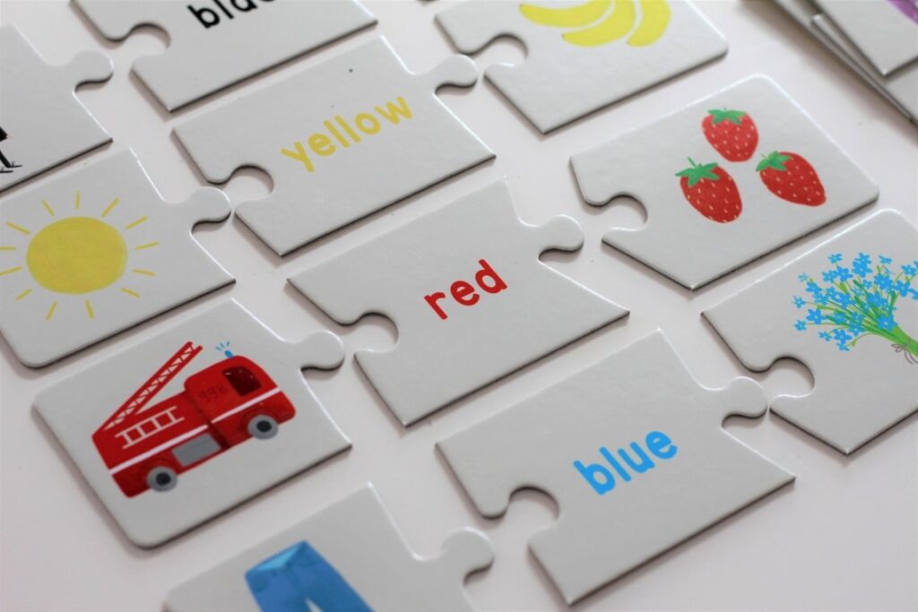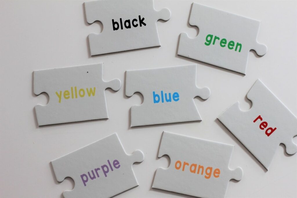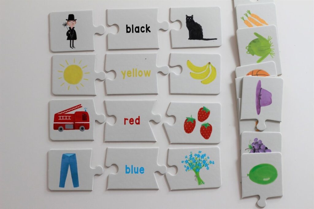 Puzzle 3-elementowe do nauki kolorów. Po środku mamy puzelek z nazwą koloru, a po jego obu stronach przykładowe postaci i przedmioty. Elementy z nazwami kolorów możemy (podobnie zresztą jak z cyframi z poprzedniego zestawu) możemy także użyć w osobnej zabawie, np. ustawiając przed dzieckiem różnokolorowe przedmioty i prosić o dopasowanie odpowiedniego kartonika.