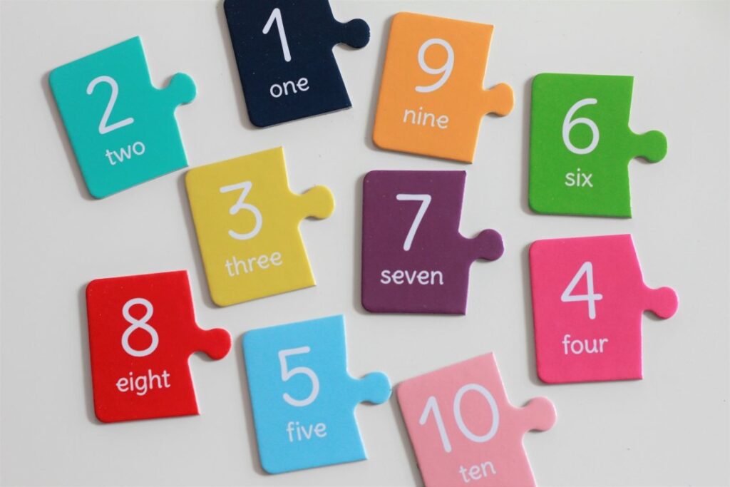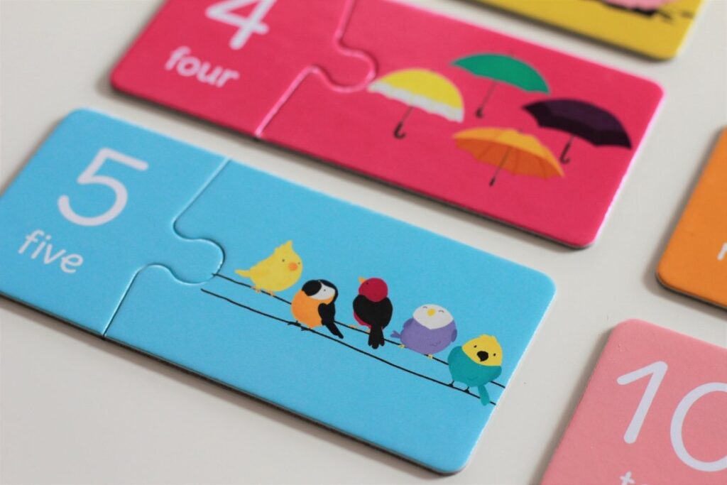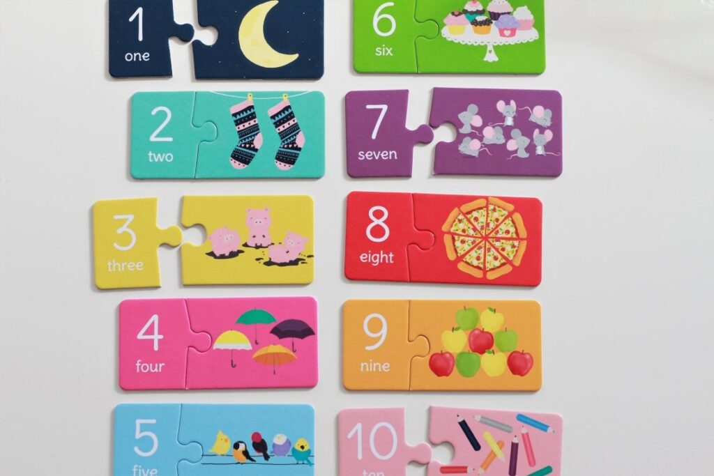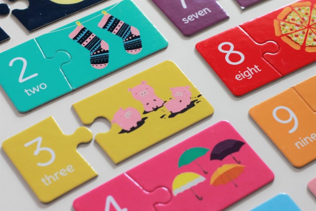 2-elementowe puzzle. Dziecko ma za zadanie policzyć przedmioty i połączyć z odpowiednią cyfrą. Możemy tu wprowadzić język angielski, ale równie dobrze możemy najpierw nauczyć dziecko liczenia po polsku.