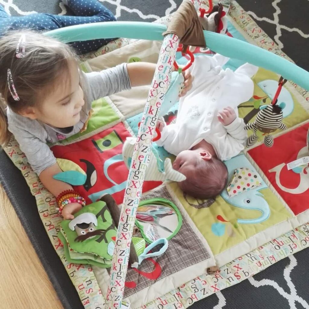 Helence kupiłam matę Skip Hop Alfabet (KLIK) i jestem z niej bardzo zadowolona. Zawiera wiele różnorodnych elementów, które grzechoczą, szeleszczą, piszczą lub grają. Są też dwa lusterka (jedno w macie, drugie w wielorybku). Jedyne na co trzeba uważać przy takich matach to pałąki, które można złamać. To stało się z Tosiową matą i dlatego musiałam kupić nową.