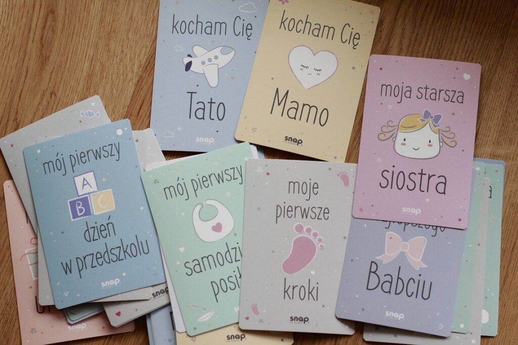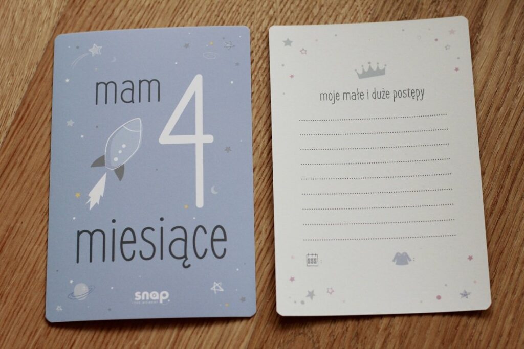 Wybrałam zestaw, w którym znajduje się 37 kart do zdjęć, przedstawiających rozwój dziecka od narodzenia aż do 3. roku życia. Mamy tu praktycznie wszystko – metryczkę, karty z miesiącami, pierwszy uśmiech, pierwszy spacer, ząbek, a nawet pierwszy dzień w przedszkolu. Karty przypominają mi o tym, żebym uchwyciła te wszystkie ważne chwile, upamiętniła je i mogła do nich wracać w przyszłości. Dodatkowo na odwrocie kart jest miejsce na notatki. Opisuję tam wszystkie ważne chwile, zdarzenia i postępy Helenki.
