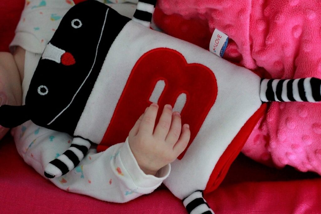 Mata to dla mnie taki must have przy niemowlaku. Dzieci powinno się układać na brzuszku od samego początku, warto to robić na bezpiecznym, nie za miękkim i nie za twardym, stabilnym podłożu. Takie oparcie daje właśnie mata edukacyjna. Po pewnym czasie niemowlak zaczyna skupiać na dłużej wzrok na wiszących zabawkach, próbować je chwycić, pacnąć.