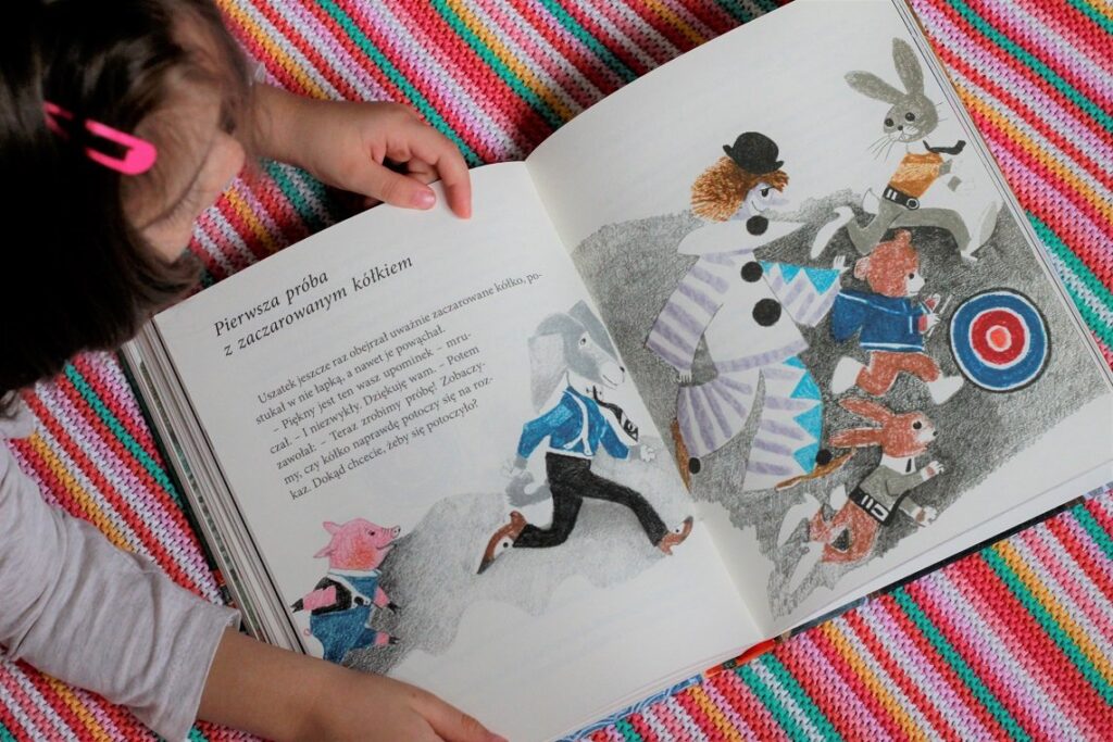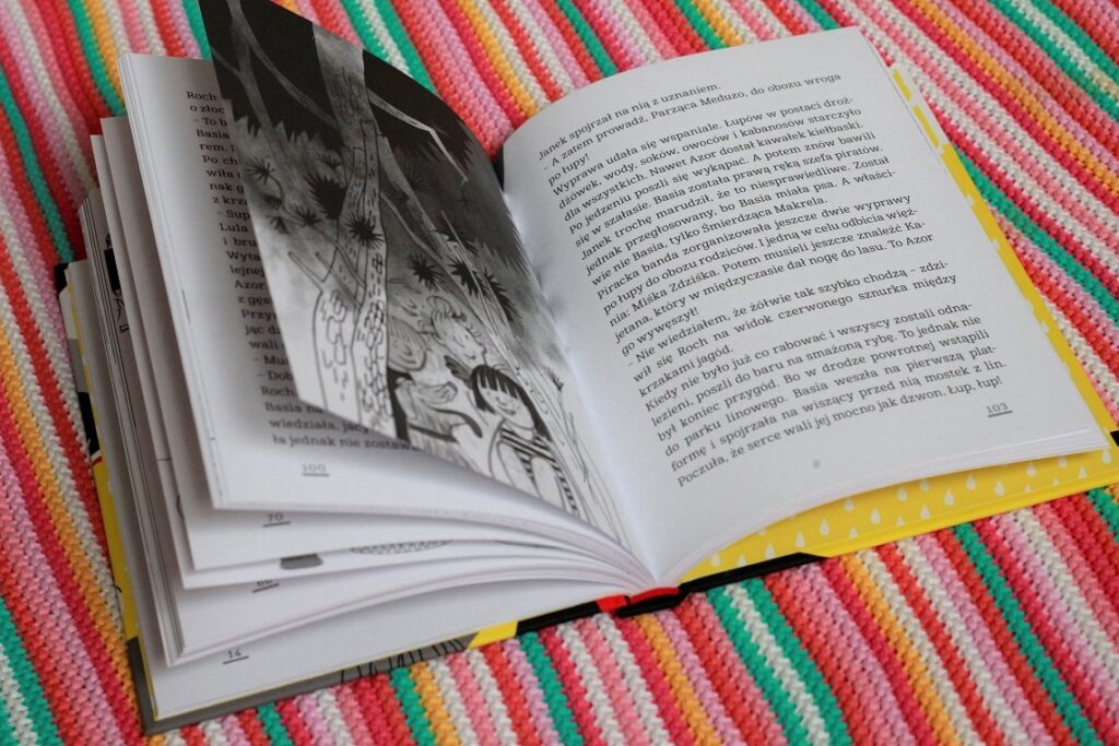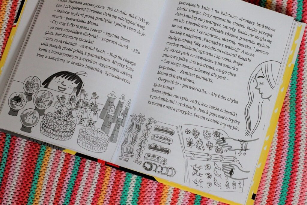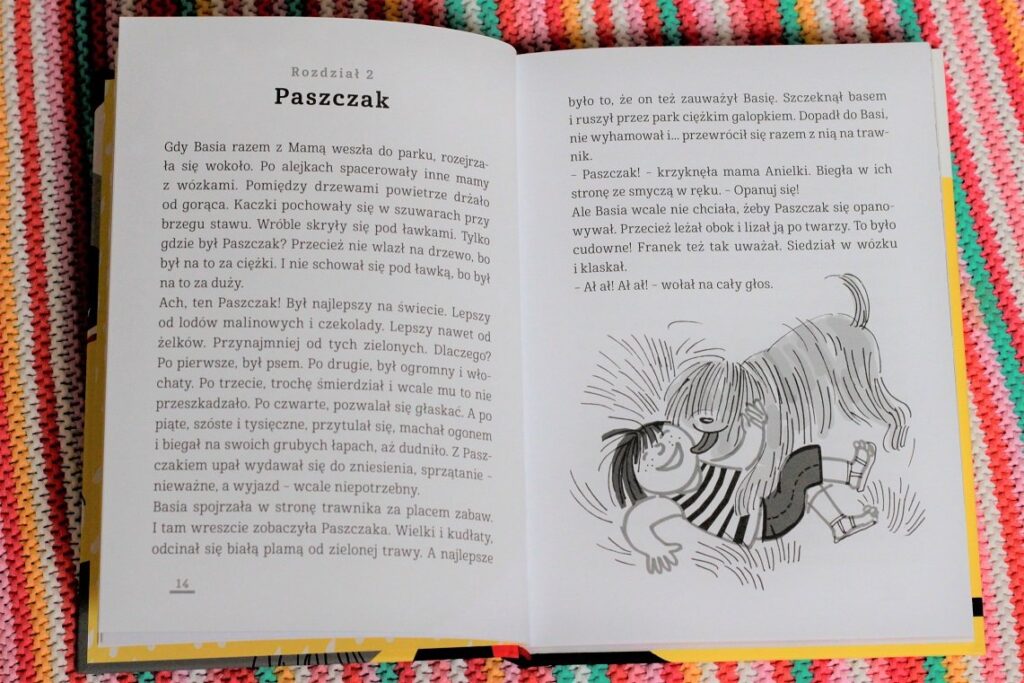 Kolejna Basiowa nowość, tym razem dla starszych dzieci. Jest to pierwsza tak długa książka o Basi i jej rodzince (166 stron!), właściwie jest to podzielona na rozdziały powieść. Czyta się ją naprawdę świetnie, treść jest tak wciągająca, że moja 4,5-latce słucha z zapartym tchem i wcale jej nie przeszkadza niewielka liczba ilustracji. Co jakiś czas wspólnie wybuchamy śmiechem, jak wtedy gdy Basia omal nie wdeptuje w psią kupę na chodniku, a Janek wraca do domu na „umarniętych nogach”. Humoru jest zresztą znacznie więcej, ale pojawiają się też poważniejsze wątki (jak przemoc wobec zwierząt), które warto przegadać z dzieckiem.