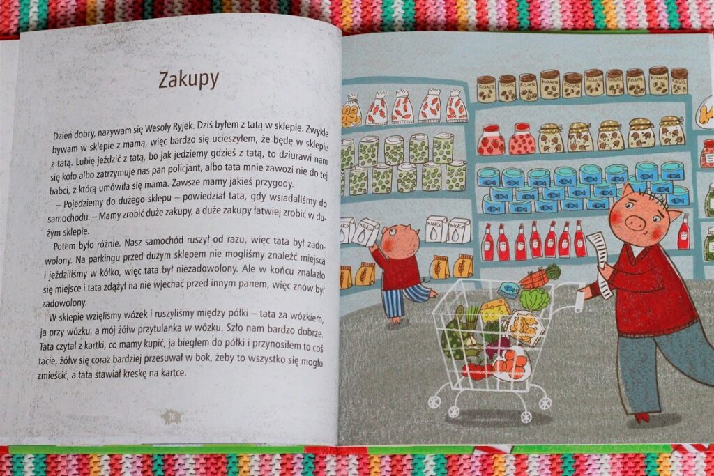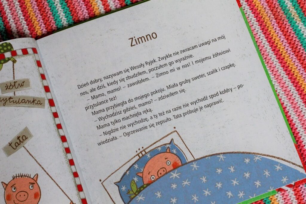 Wesoły Ryjek towarzyszy nam przy każdej chorobie, złym samopoczuciu i foszkach mniejszych lub większych. Jakoś tak się utarło, że w takich chwilach zawsze sięgam po opowiadania o sympatycznym prosiaczku, jego mamie, tacie i żółwiu przytulance. Wojciech Widłak potrafi wyczarować magiczny, spokojny, ciepły klimat na każdej stronie. Przygody Wesołego Ryjka są bardzo proste, codzienne, bo tu też o tę prostotę chodzi, o cieszenie się każdym dniem, każdą chwilą, którą spędzamy z najbliższymi, każdym uśmiechem, posiłkiem, spacerem, rozmową. Każde opowiadanie opatrzone jest dodatkowo zaskakującą, zabawną puentą, nie sposób się nie uśmiechnąć, zaręczam!