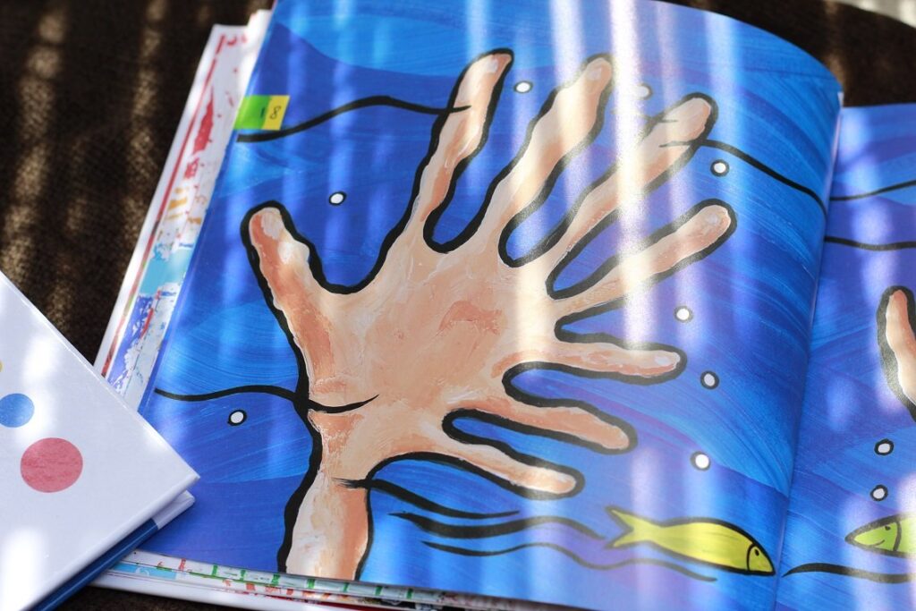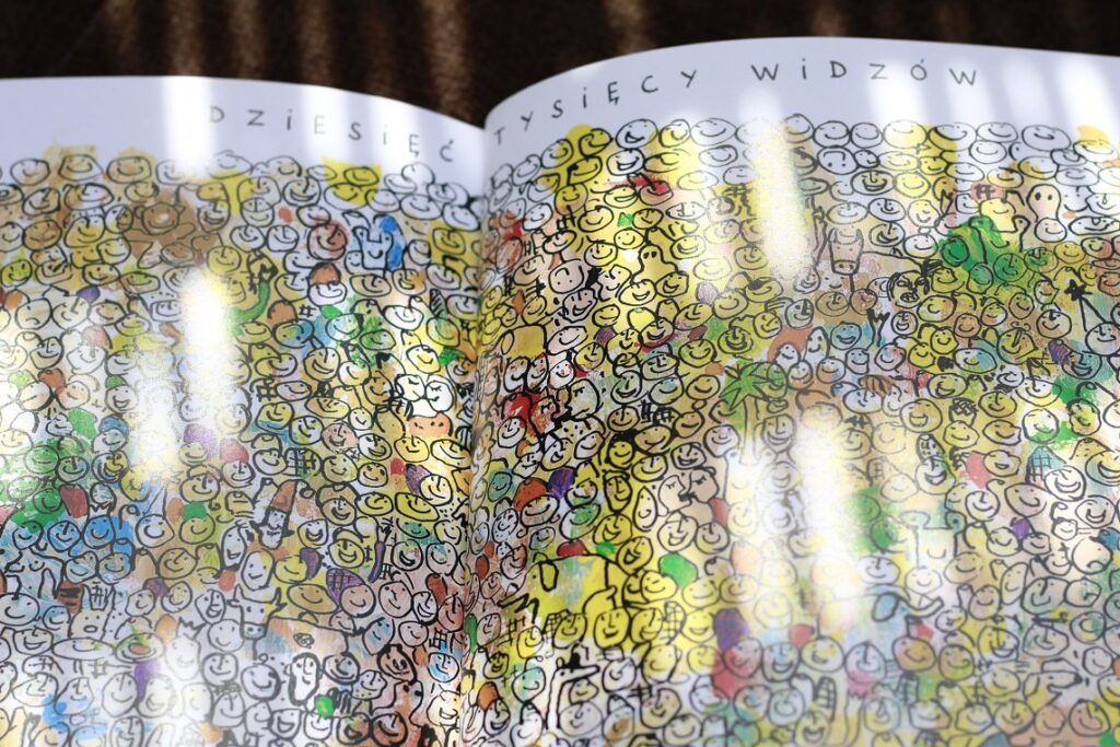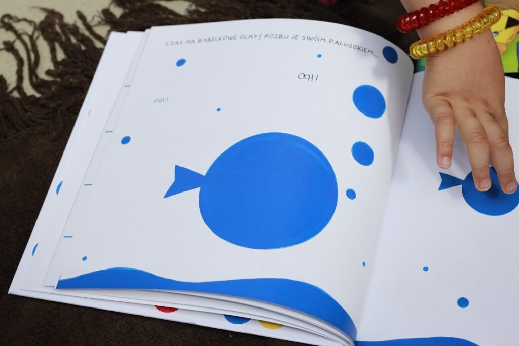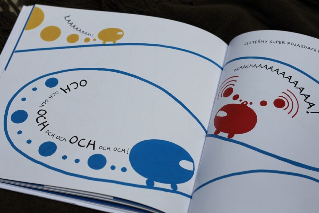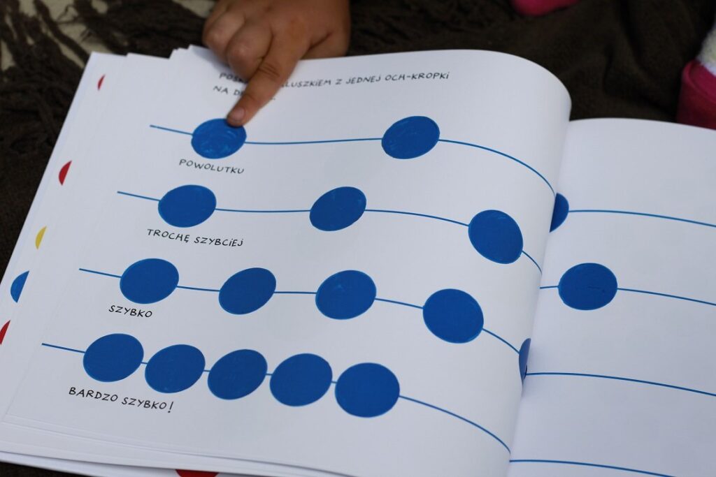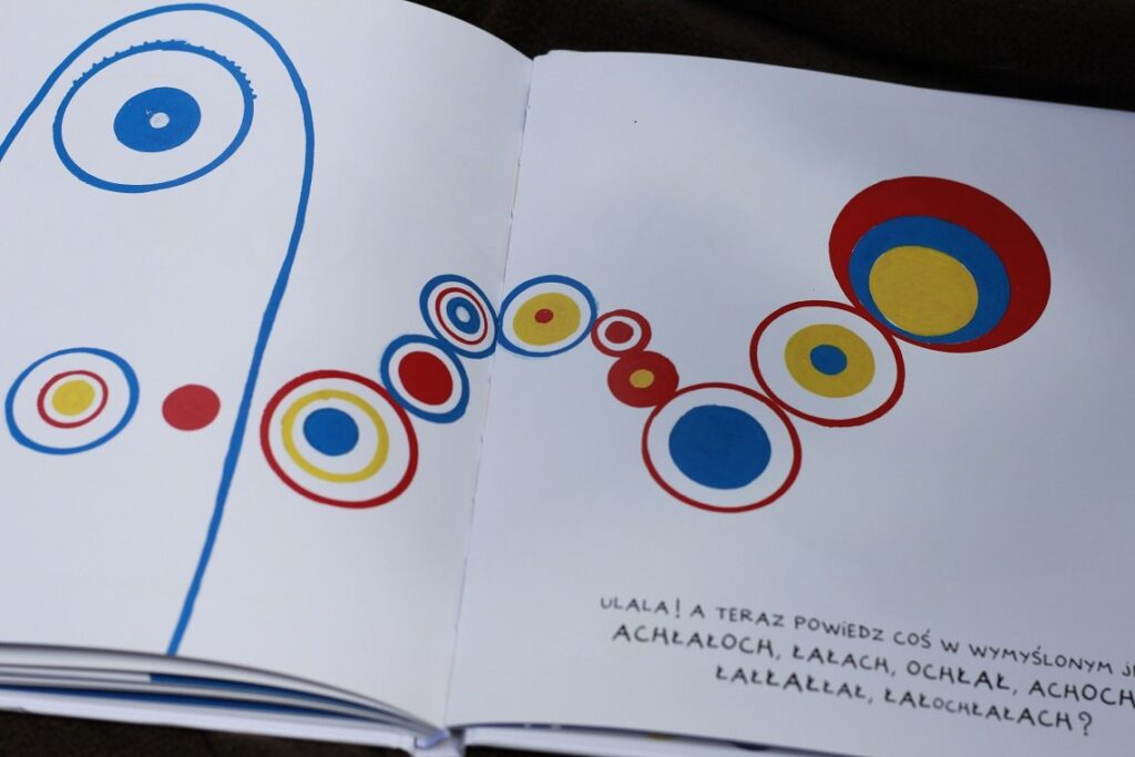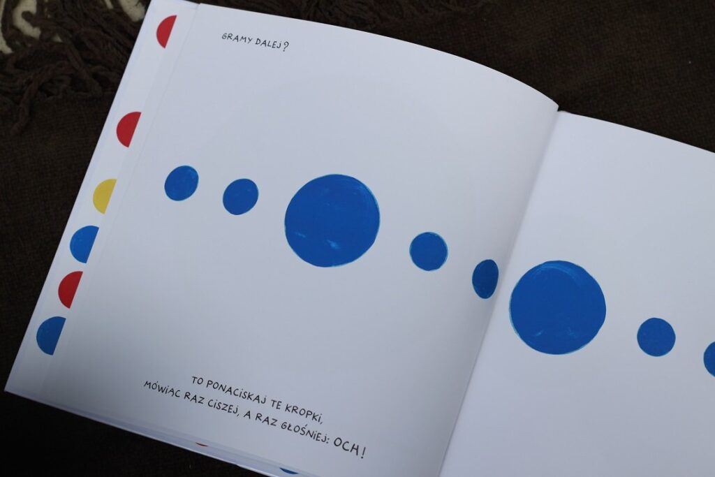 Książka chyba jedyna w swoim rodzaju, przynajmniej ja z żadną podobną się jeszcze nie spotkałam. Wizualnie przypomina klasyczną „Naciśnij mnie” – ponownie napotykamy różne kropki, które skaczą, rosną, maleją i robią różne zwariowane rzeczy, jak na Tulleta przystało. Jednak to nie wszystko – każda strona, każda kropka przynosi inne zadanie związane z wydawaniem dźwięków. I to jest genialny pomysł, a zarazem świetna zabawa dla przedszkolaków. Dzieci zachęcane są do różnorodnego modulowania głosu, szeptania, krzyczenia, śpiewania, a także do liczenia i podążania paluszkiem po różnych, czasem skomplikowanych kreskach.