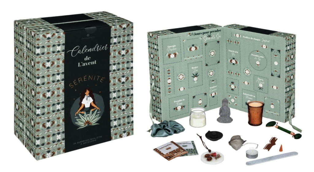 Kalendarz adwentowy z niespodziankami związanymi z domowym SPA, m.in. kadzidełka, przyżąd do masażu, świece zapachowe, dyfuzor do herbaty.