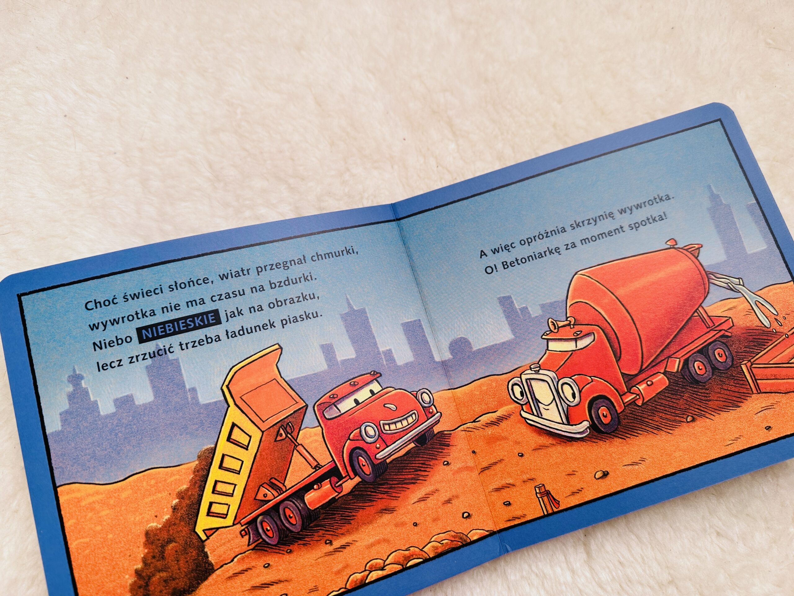 Kolejne spotkanie z dzielną ekipą pojazdów budowlanych, która żadnych prac się nie boi! Tym razem jednak w książeczce skupimy się nie tylko na projekcie do wykonania, ale i na kolorach. Dzielna wywrotka i betoniarka mają za zadanie zbudowanie drogi. Prześledzimy ich pracę przez cały dzień, a przy okazji poznamy kolory – zauważymy, że beton jest szary, opony czarne, rury zielone i parę innych. Dodatkowo każda strona ma ramkę w odpowiednim kolorze.