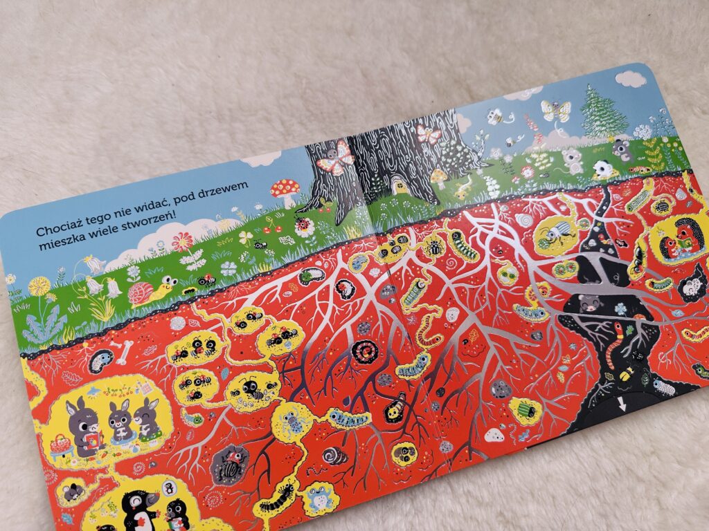 Seria Niesamowity spacer to grube kartonowe strony z przesuwanymi i wysuwanymi elementami, proste i pozytywne wierszyki oraz błyszczące srebrzyście ozdobniki w dużych ilościach. Każda książeczka zabiera nas na spacer, a tym razem odwiedzimy przepiękne, ogromne drzewo, które jest schronienim i domem dla wielu zwierzątek. Zajrzymy pod ziemię, do korzeni, na trawę i w pobliskie krzaczki, do dziupli i w piękną koronę drzewa. Poznamy zwierzątka, które tam mieszkają, bawią się, wychowują dzieci i zdobywają pożywienie. Urocza książeczka dla maluchów!