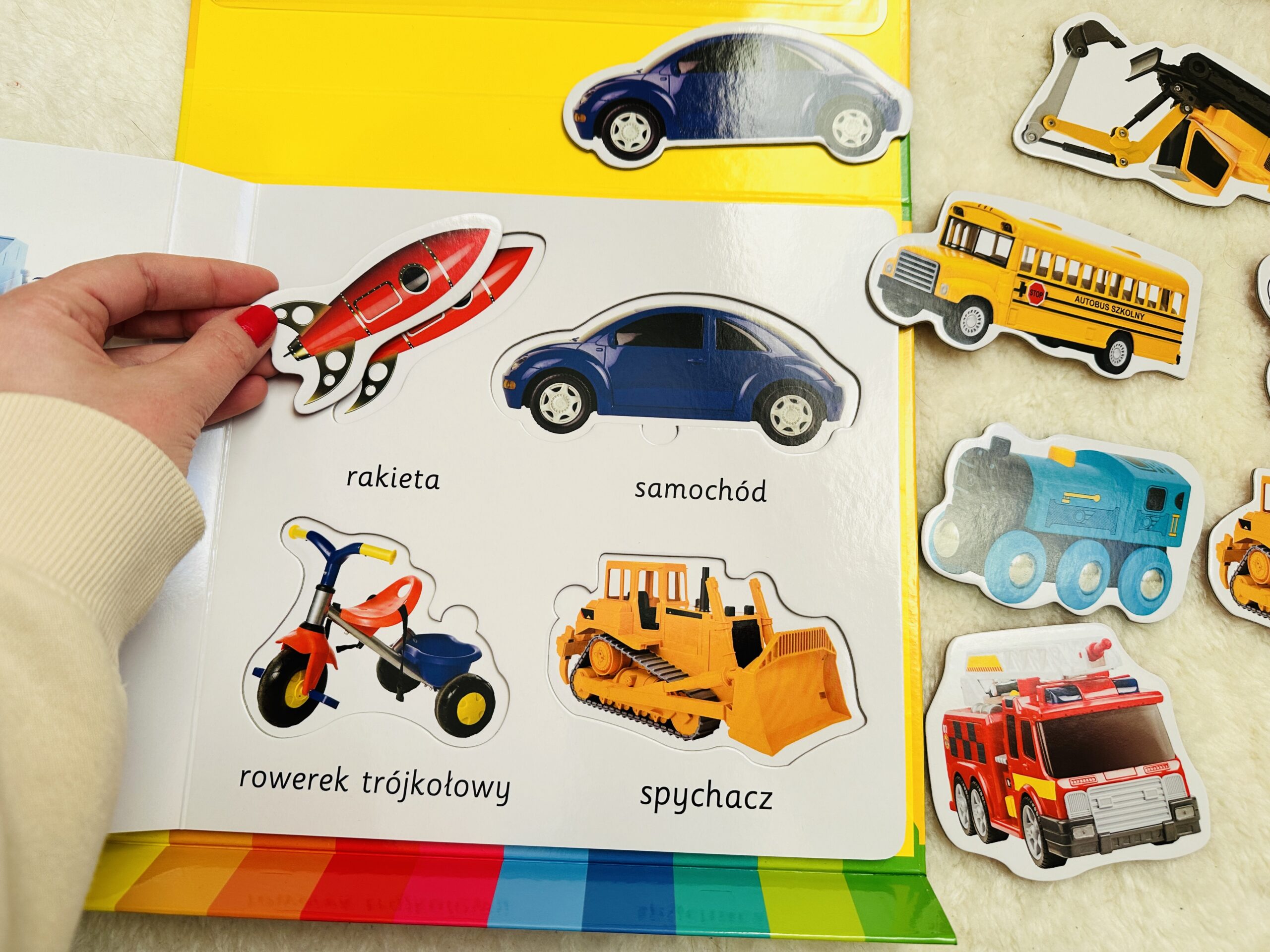 A teraz książki-zabawki, które na pewno spodobają się małym miłośnikom puzzli i układanek. Książki zostały wydane bardzo starannie – każda z nich ma magnetyczne zamknięcie i kryje 12 puzzli tematycznych. W „Pojazdach” są to m.in. samochód, rakieta, wóz strażacki, lokomotywa i autobus szkolny, a w „Zwierzętach” pies, krowa, świnka morska, niedźwiedź i motyl. Zadaniem dziecka jest odnajdowanie i dopasowywanie odpowiednich elementów do zagłębień w książkach. Duży plus za realne fotografie pojazdów i zwierząt! Po drugiej stronie puzzli znajdują się podpisy obiektów, dzięki czemu możemy wykorzystać te zestawy również do zabawy ze starszymi dziećmi.