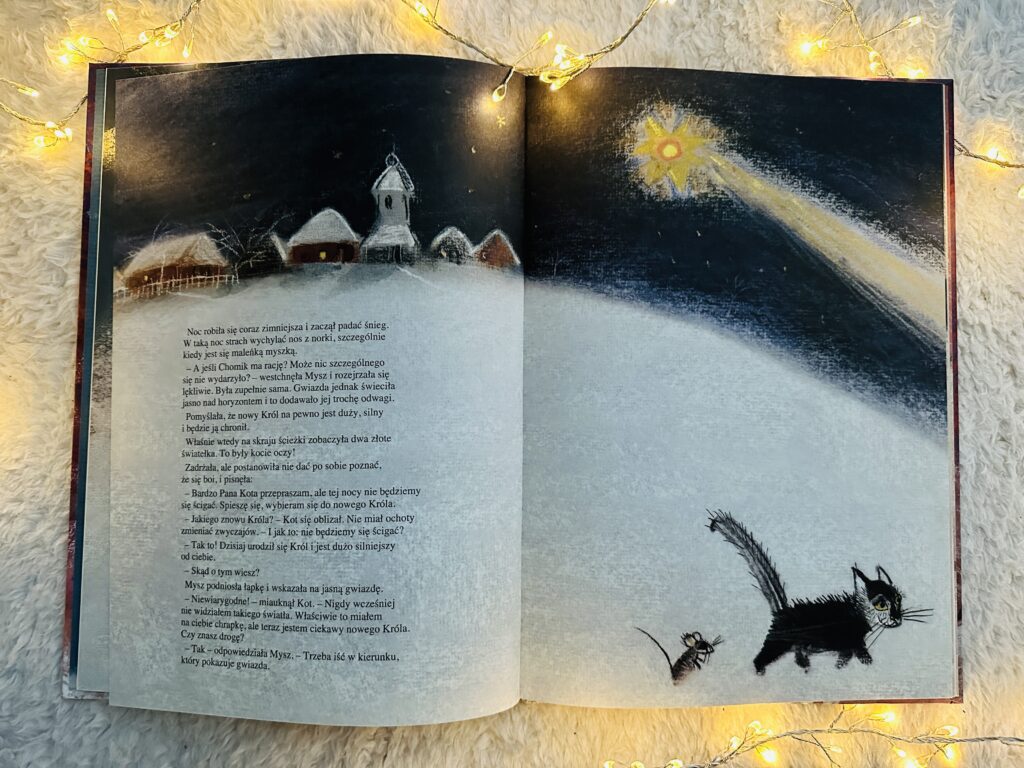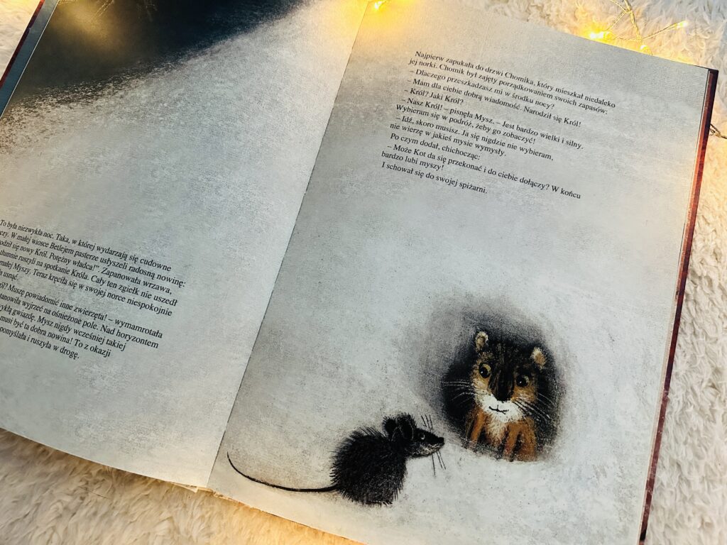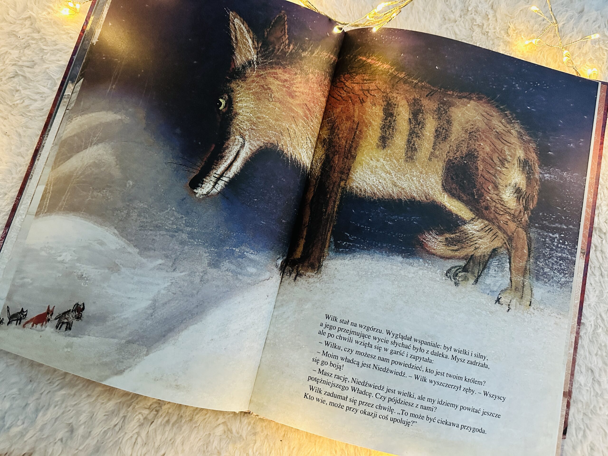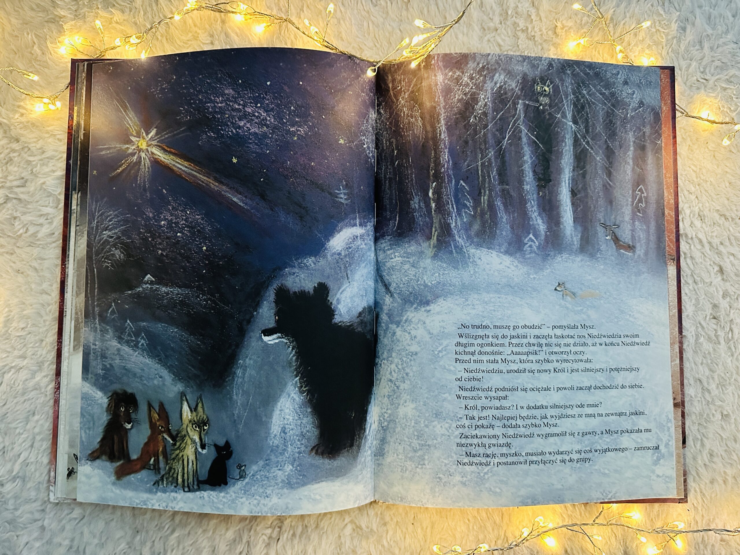 „Kto obudził niedźwiedzia?” to ciepła, pięknie ilustrowana opowieść o małej Myszy, która nocą wyrusza w drogę razem z innymi zwierzętami – Kotem, Psem, Lisem, Wilkiem i Niedźwiedziem. W jakim celu? By powitać nowego Króla, najsilniejszego na świecie, który właśnie narodził się w małej stajence. Historia jest prosta i pełna uroku, a ilustracje Józefa Wilkonia nadają jej wyjątkowy, malarski klimat. Zwierzęta wspólnie odkrywają, że nawet bardzo różne stworzenia mogą iść jedną drogą i wspierać się nawzajem, a najmniejsze z nich – zjednoczyć pozostałe. To spokojna, nastrojowa opowieść, idealna do czytania zimą przed świętami Bożego Narodzenia.