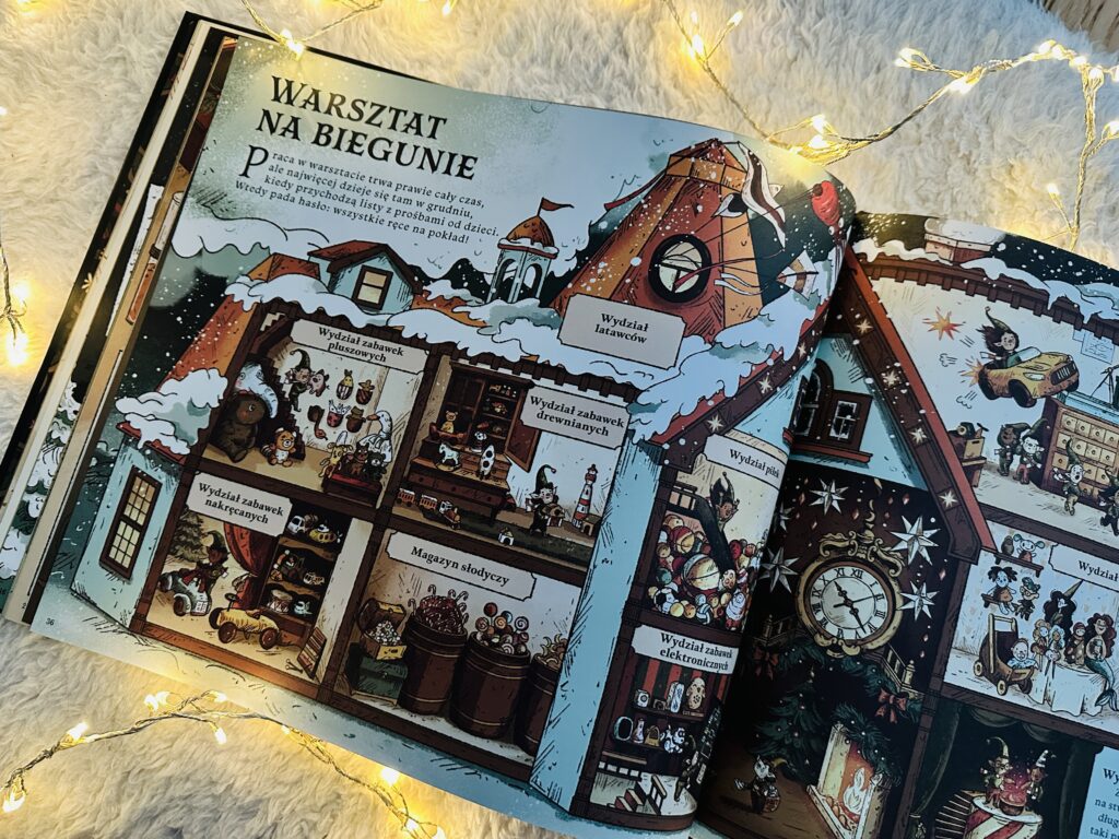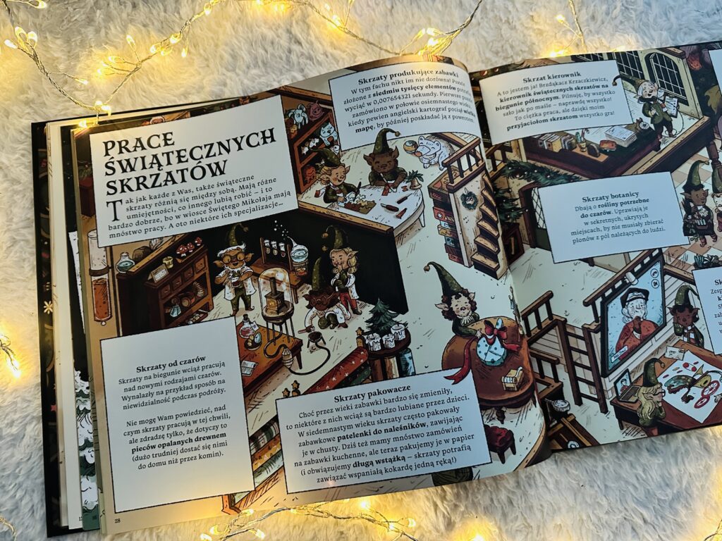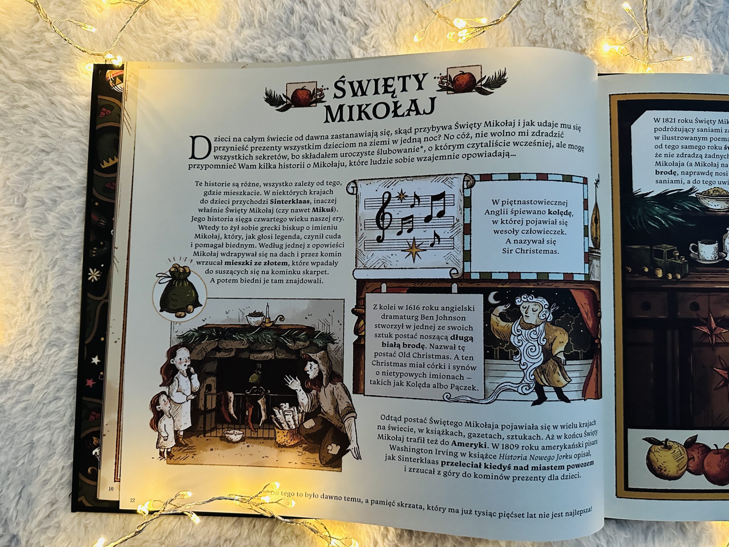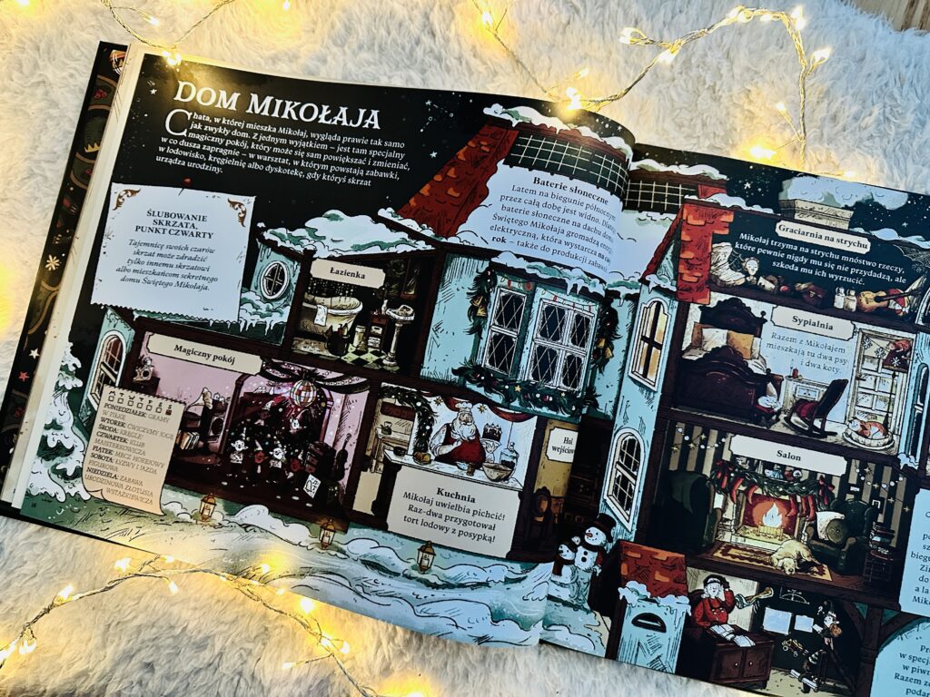 Wspaniała książka, która łączy magiczny świat latających reniferów, pracowitych skrzatów, czarodziejskiego warsztatu i tajemnic Świętego Mikołaja z ciekawostkami świata przyrody, informacjami o zwierzętach, kulturze, planecie, ogólnej wiedzy. Skąd pochodzi Święty Mikołaj? Jak wygląda jego dom? Co najchętniej jada się na biegunie?