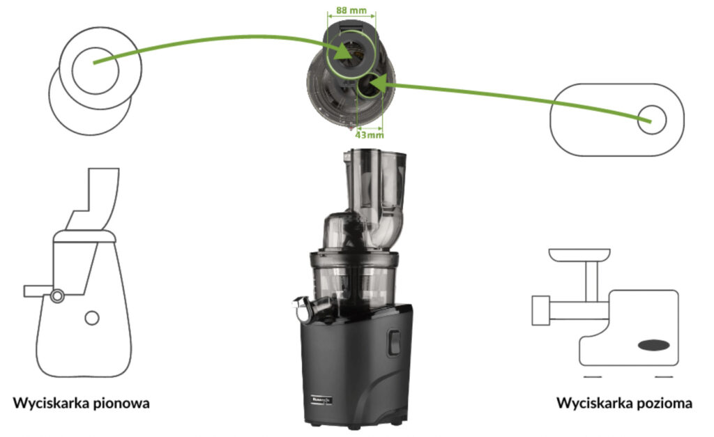 • podwójny wlot – mniejszy przede wszystkim na włókniste rzeczy, ale nie tylko: np. seler naciowy, jarmuż, botwinkę, różne natki, marchewki, ogórki, ananasa. Ślimak wyciskarki tnie te produkty na mniejsze części. Większy wlot na pozostałe warzywa i owoce. Tym samym Kuvings Revo łączy w sobie zalety wyciskarki pionowej (jak Kuvings Evo) i poziomej. Co ciekawe, można jednocześnie wrzucać składniki do obu wlotów (np. łodygę selera i pomarańczę), bo system smart cut sam sobie „dawkuje” produkty z mniejszego wlotu – bez ryzyka zapchania się wyciskarki.
