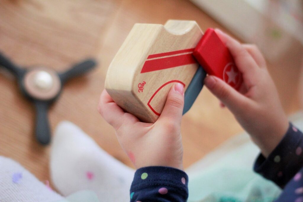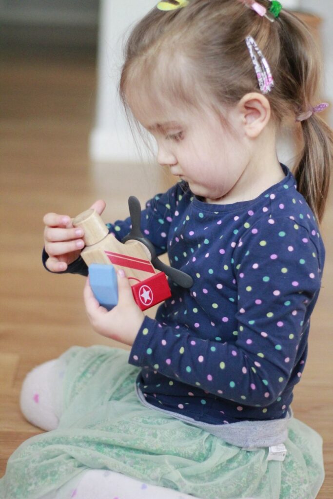 Na szczęście nie musiałam! Jeden z najprostszych zestawów klocków Tegu – Stunt Team Looper, składający się zaledwie z 7 klocków, okazał się hitem. Tosia oszalała na punkcie tych klocków. Odkąd pojawiły się w naszym domu, nie ma dnia, żeby nie sięgała po nie i nie tworzyła przeróżnych, często wręcz nieprawdopodobnych konstrukcji. Zaczęło się niewinnie – od odwzorowywania przykładów pokazanych na pudełku. A potem zaczęła się jazda bez trzymanki połączona z kalamburami: „Mamusiu, zgadnij co zbudowałam!” („czerwony kapeć!”, tak raz brzmiała poprawna odpowiedź :))), bieganie po domu z klockowym samolotem, helikopterem, a nawet żyrafą. Chyba nic mnie już nie zdziwi, dziecięca wyobraźnie faktycznie nie zna granic, a klocki Tegu w niesamowity sposób ją pobudzają.