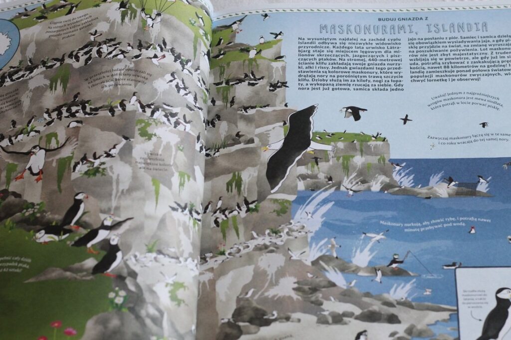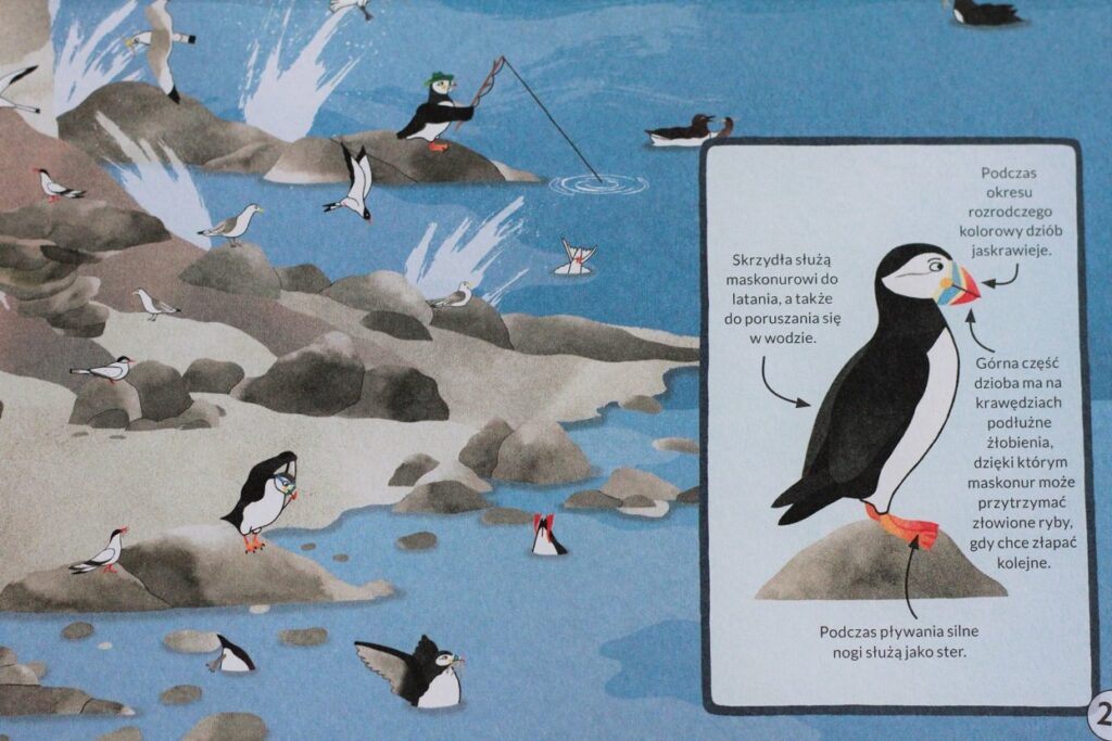 Czemu by tej dawki jeszcze nie zwiększyć? Moją pierwszą myślą było oczywiście wyszukanie w internecie hasła „maskonury”, jednak chcąc dać córce dobry przykład, namówiłam ją do poszperania w naszych książkowych zbiorach i… udało się :) Odnalazłyśmy te sympatyczne wodne ptaki w jednym z naszych najnowszych nabytków – Atlasie przygód zwierząt”, wydanym przez Naszą Księgarnię. I faktycznie, znalazłyśmy sporo nowych ciekawostek o maskonurach, a przy okazji wyszukałyśmy też płomykówki i foki.