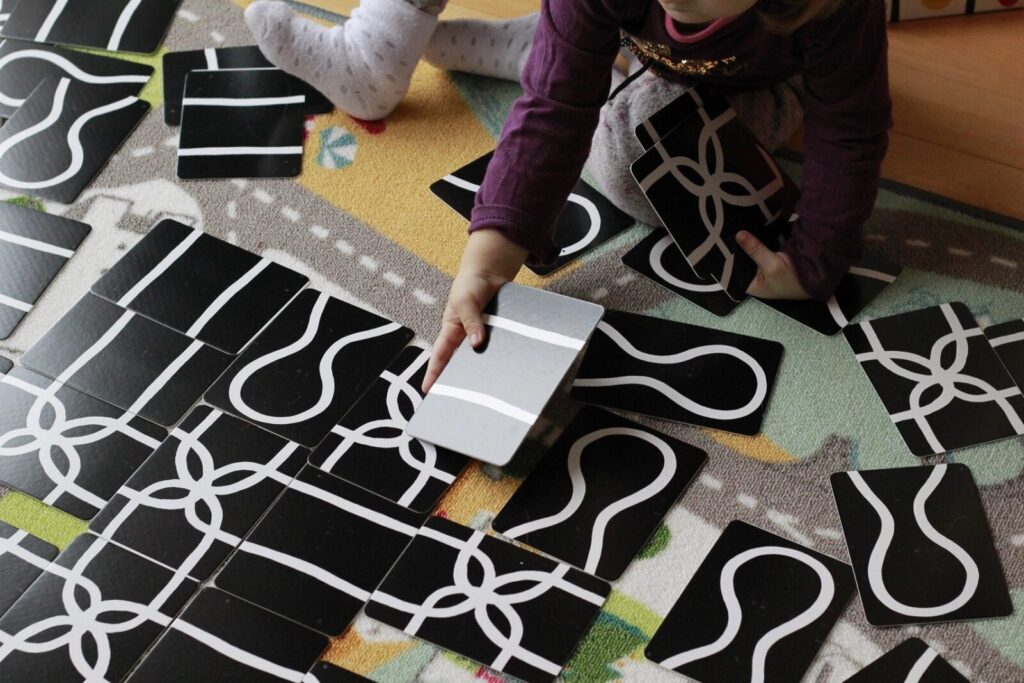 Co najmniej dwa razy dziennie rozkładamy karty i układamy różne niezwykłe wzory, szukamy takich samych elementów, Tosia w tą i z powrotem przekłada karty, wkłada je do pudełka i wyjmuje je z niego. Układa je wzdłuż pasów ruchu na dywaniku i dopasowuje kolory do siebie. Ostatnio nawet wymyśliła, że karty to instrumenty muzyczne, rozdaje po kilka i mówi: „Mama, graj na skrzypcach! Babciu, masz trąbkę! A ja gram na bębenku.” I tak sobie „gramy” na tych kartach, a ja zachwycam się dziecięcą wyobraźnią. Czasami najprostsze zabawki są najlepsze.