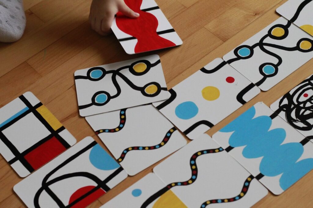 Memo Labirynty Tulleta jak sama nazwa wskazuje to też gra memory. W zależności od wieku dziecka można dopasowywać ilość par, jednak nie jest to wcale łatwa zabawa! Wzory są abstrakcyjne, kolory się powtarzają, przez co trudniej je zapamiętać, niż np. standardowe zwierzątka. Dla nas to jednak nawet lepiej – na razie bawimy się klasycznym zestawem Memo, a ten będzie na później.
