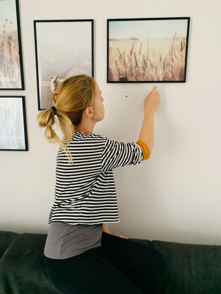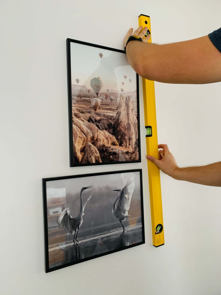 Nasze plakaty przyszły jak zawsze dobrze zabezpieczone. Szybciutko je oprawiliśmy i ułożyliśmy na podłodze według wybranego wzoru. Potem w ruch poszła miarka, poziomica, kartka i ołówek, co by dobrze wymierzyć i wywiercić w odpowiednich miejscach dziury. Powieszone ramki można przesunąć o kilka milimetrów w poziomie, więc łatwo skorygować ewentualną drobną pomyłkę. Poszło nam zadziwiająco sprawnie, szybko i nawet się nie pokłóciliśmy z mężem ;)