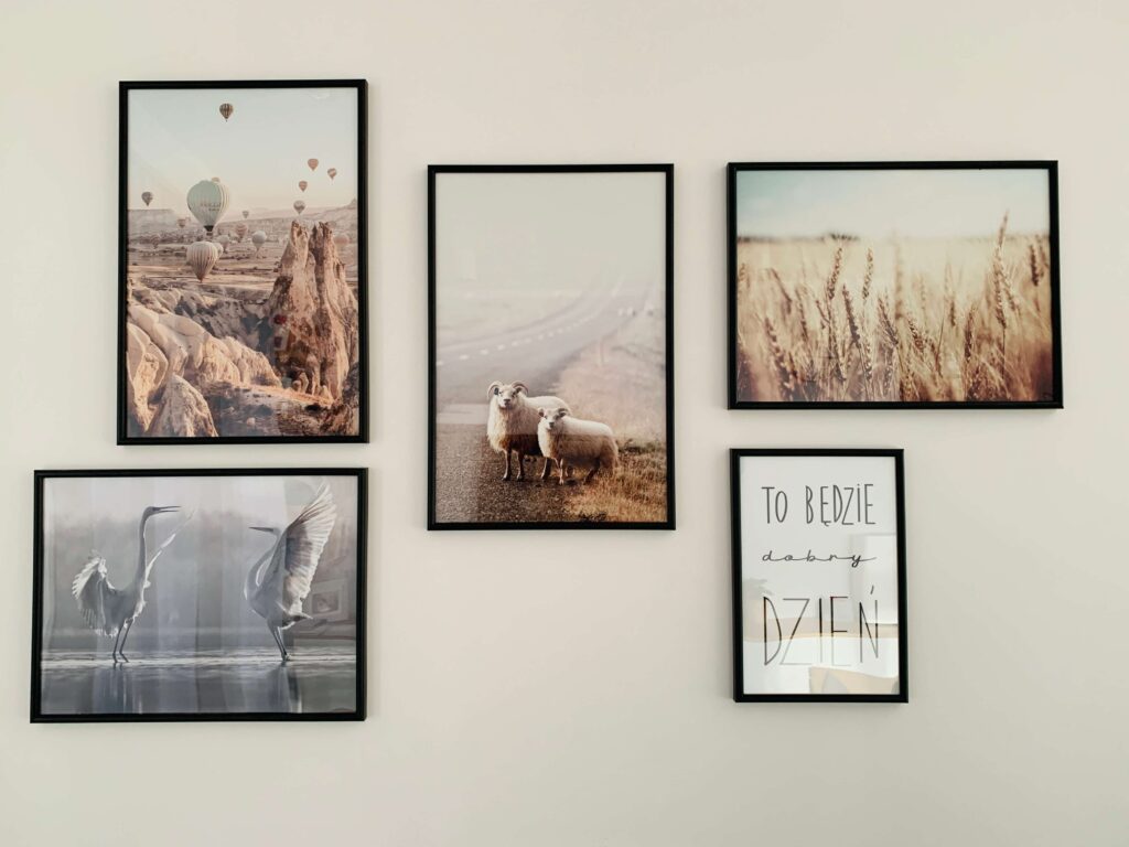 Tak jak już wspomniałam, wybierając plakaty wiedziałam jaki efekt chcę osiągnąć – odprężenie, spokój, ale też zależało mi na pięknych miejscach i być może zwierzętach. Zaczęłam więc przeglądać kategorię Natura i krajobrazy. Od razu wpadł mi w oko przepiękny plakat z owcami („Niezwykli autostopowicze”) oraz niesamowity kamienisty krajobraz z balonami („Bajeczna podróż”), które od lat uwielbiam! W tej samej kolorystyce dobrałam kłosy pszenicy („Złote pole”). Chciałam nawiązać też do reprodukcji starych fotografii Warszawy, które mamy powieszone w korytarzu, więc kolejne plakaty w salonie są czarno-białe. Wybór padł na grafikę „To będzie dobry dzień”, na widok której co rano się uśmiecham i majestatycznych czapli („Miłość czapli”), które wytypowała Helenka.