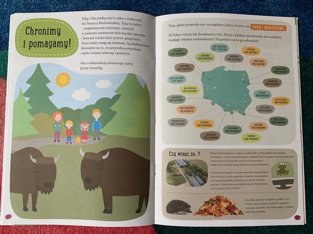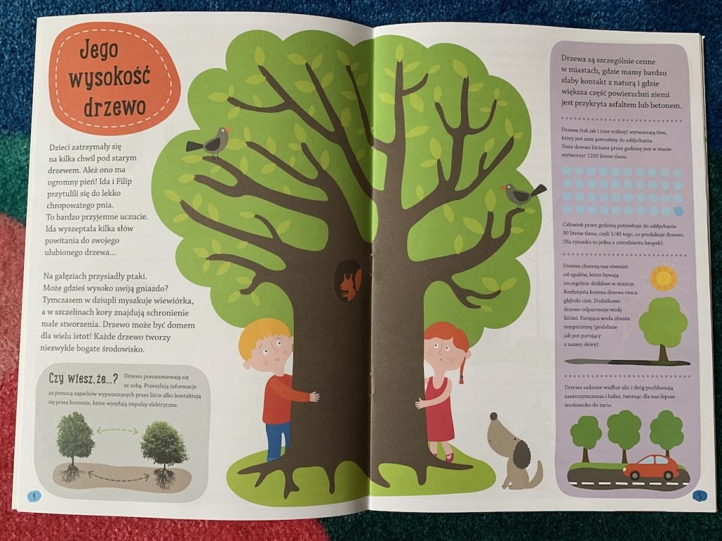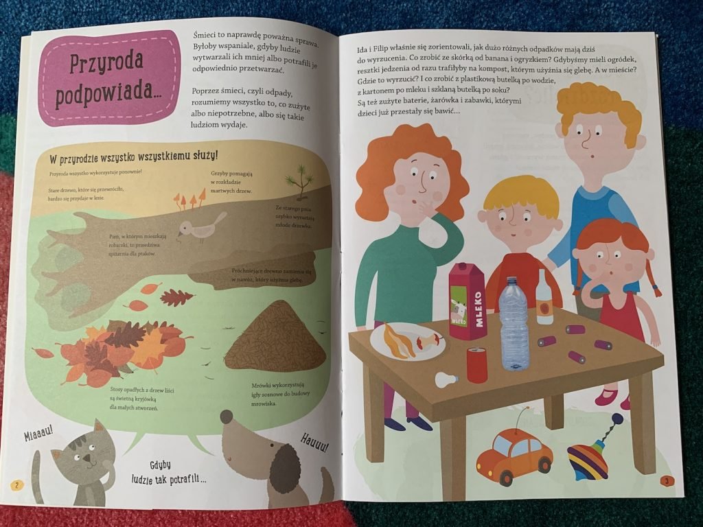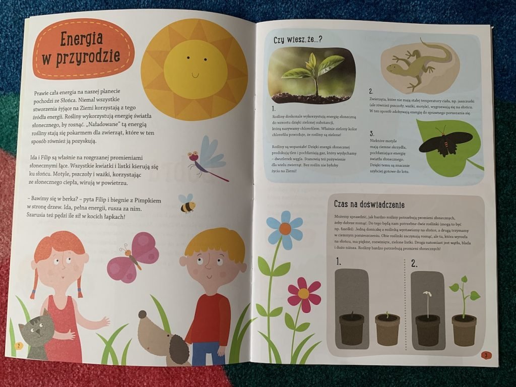 Dzieci dowiedzą się tego wszystkiego w przystępnej formie, śledząc przygody Idy i Filipa oraz ich kotka i pieska. Bardzo podoba mi się to, że czytając książki w prosty sposób dawkować wiedzę, dostosowując do wieku dziecka. Młodszym dzieciom możemy czytać główny tekst, starszym – również infografiki, sekcję „czy wiesz, że”, dodatkowe informacje.
