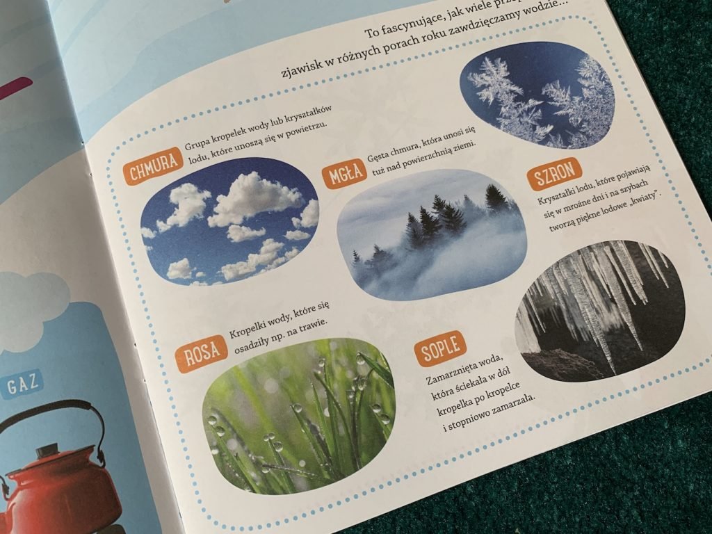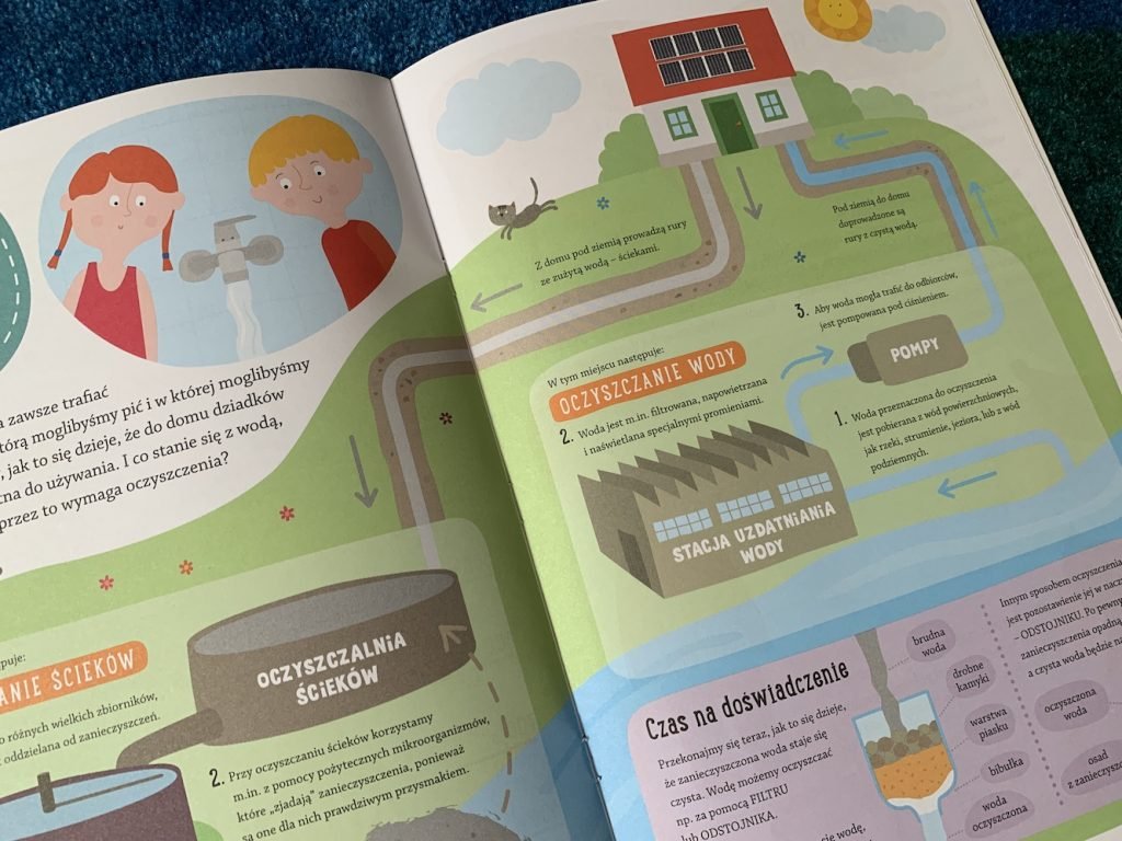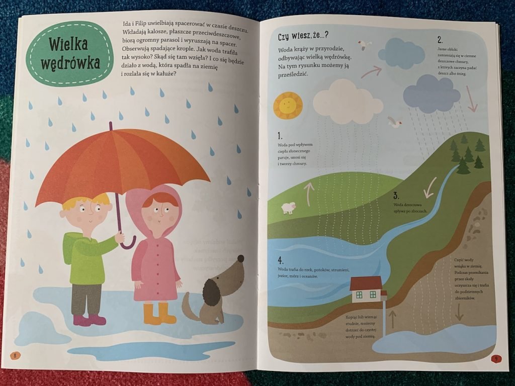 Dzieci poznają 3 stany skupienia wody, dowiedzą się, jak ją oszczędzać i dlaczego to takie ważne, a nawet sprawdzą, co dzieje się z brudną wodą po spłukaniu toalety. Ta książka jest prawdziwą skarbnicą wiedzy jeśli chodzi o wodę i jej znaczenie w życiu każdego człowieka, ale i w zachowaniu równowagi w środowisku.