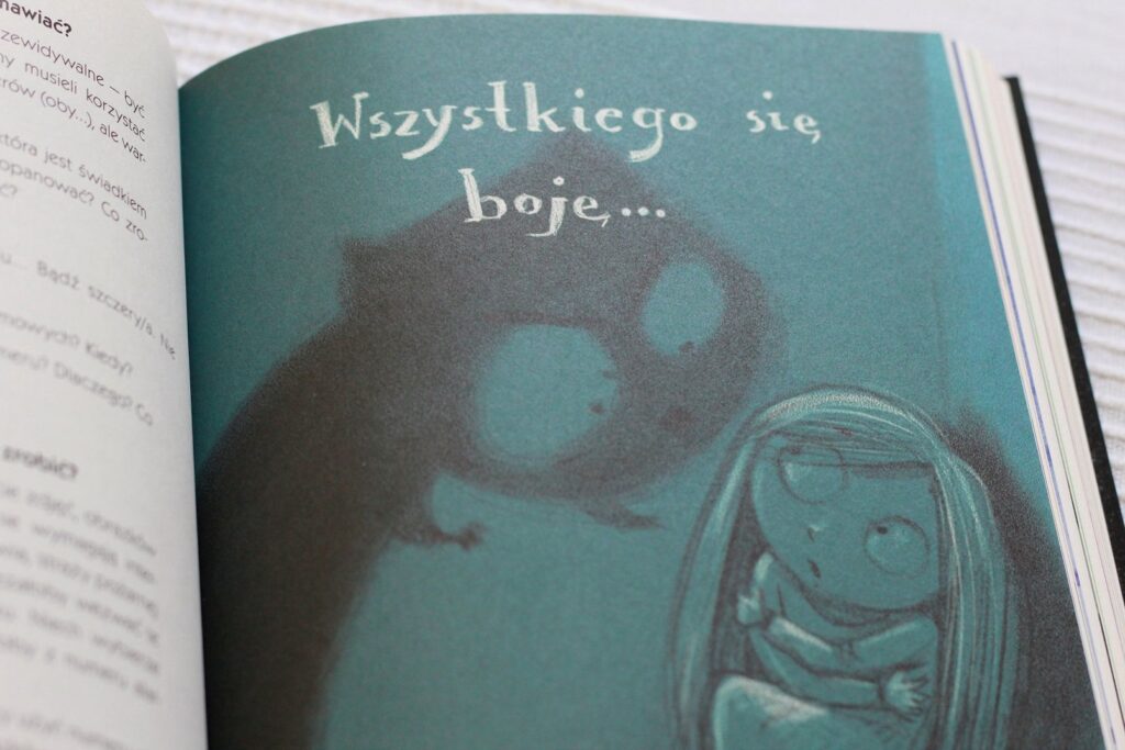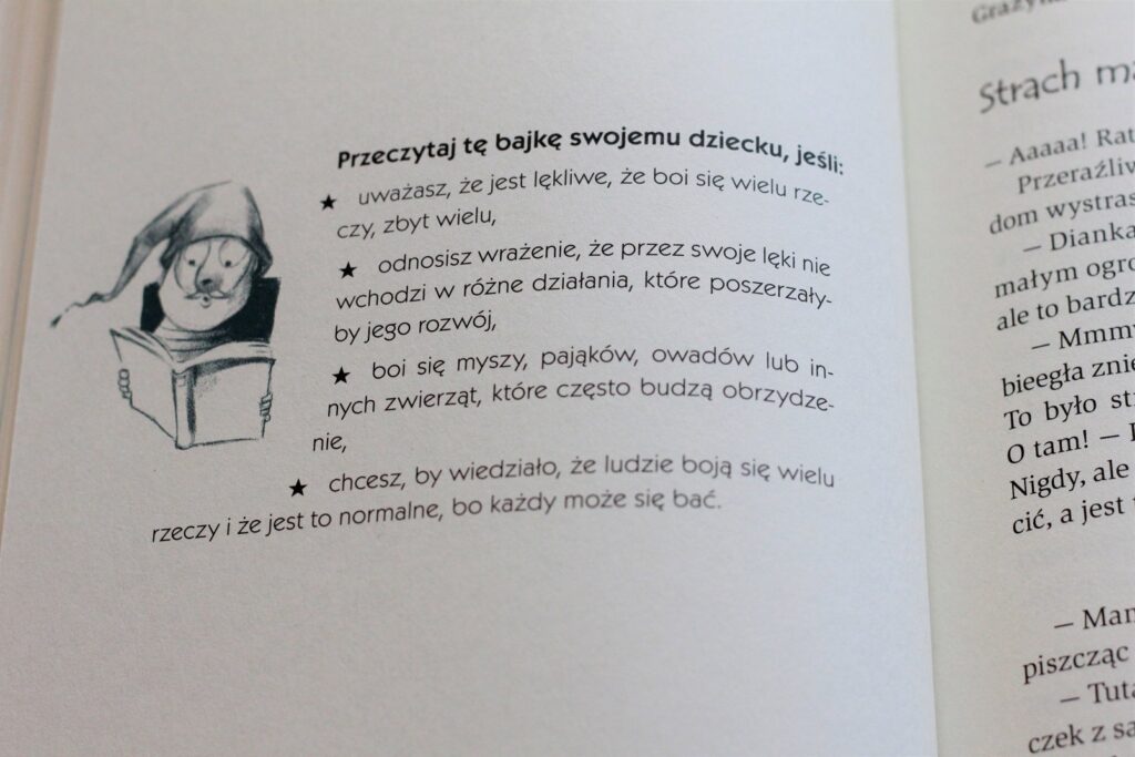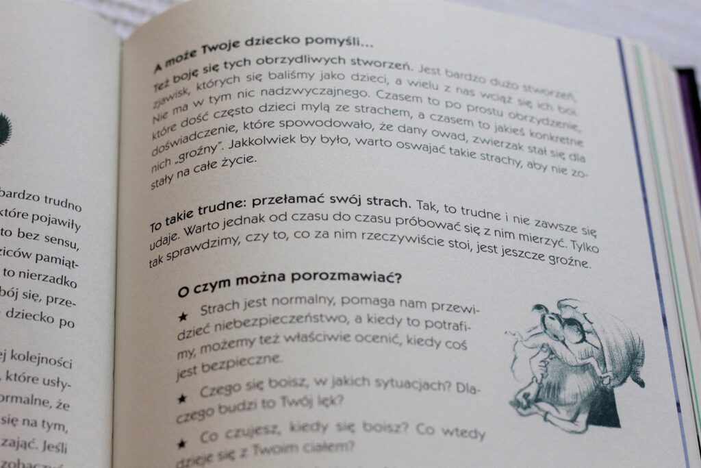 Tekstu jest dużo, obrazków mniej (np. mogą się zdarzyć 3 strony bez ilustracji), ale naprawdę warto tę książkę mieć i starać się czytać dzieciom w razie potrzeby i zapobiegawczo :)