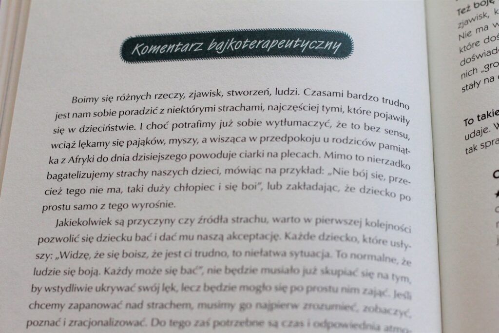 Każdy temat mi kilka stałych elementów – na początek dowiadujemy się jaki jest cel bajki, potem mamy bajkę dla dziecka oraz komentarz bajkoterapeutyczny dla rodzica i wskazówki o czym można porozmawiać z dzieckiem po przeczytaniu bajki i co jeszcze można zrobić, żeby głębiej zapoznać się z tematem, bardziej pomóc dziecku.