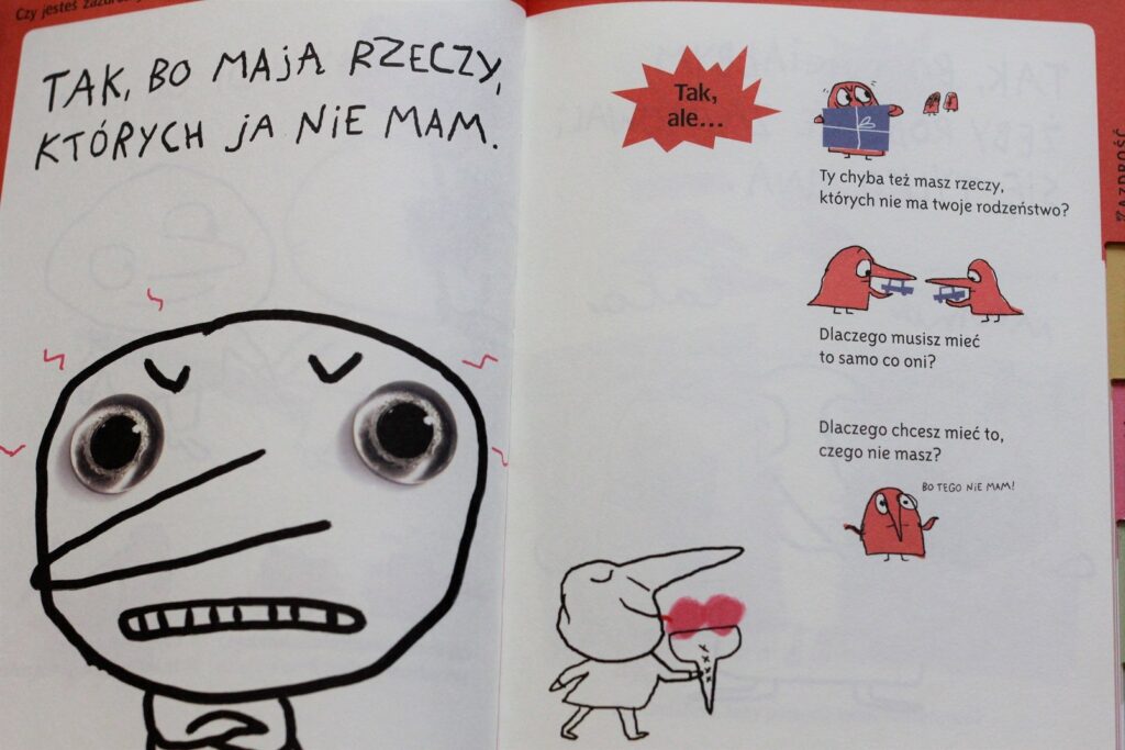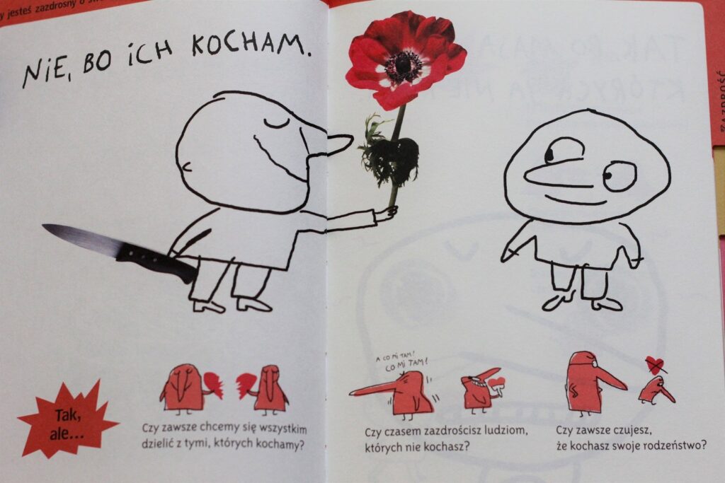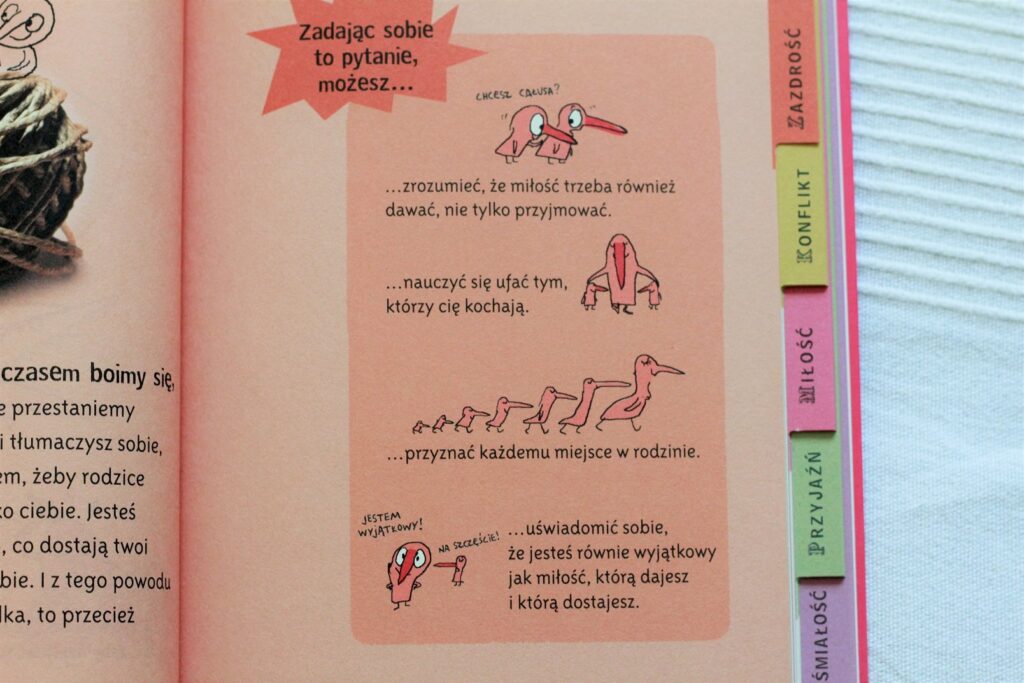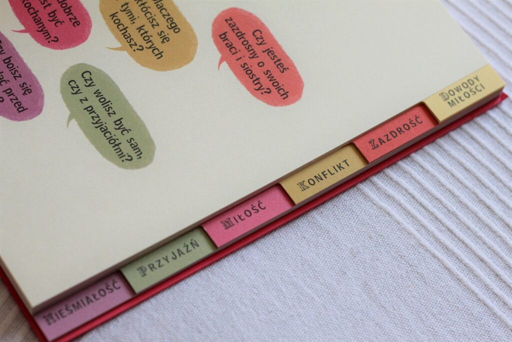 Świetna pomoc dla rodziców dzieci, które zaczynają przygodę ze szkołą, a nawet ciut młodszych. Książka składa się z mnóstwa pytań, podzielonych na 6 kategorii: dowody miłości, zazdrość, konflikt, miłość, przyjaźń i nieśmiałość. Nie znajdziemy tutaj zbioru łatwych odpowiedzi, wprost przeciwnie – jedyne odpowiedzi, które się pojawiają, mają na celu zadawanie kolejnych pytań, sięganie głębiej, do sedna, do wielu wątków pobocznych. Książka pomaga nam poznać nasze dziecko, jego problemy, doświadczenia i opinię na wiele tematów. Bardzo ważnych tematów.