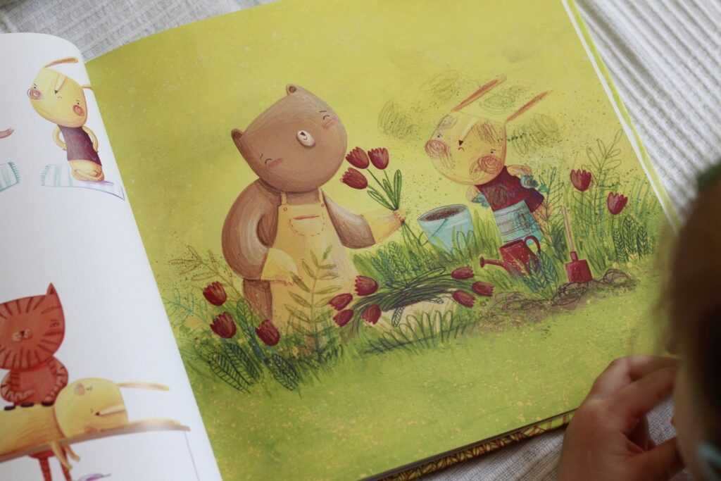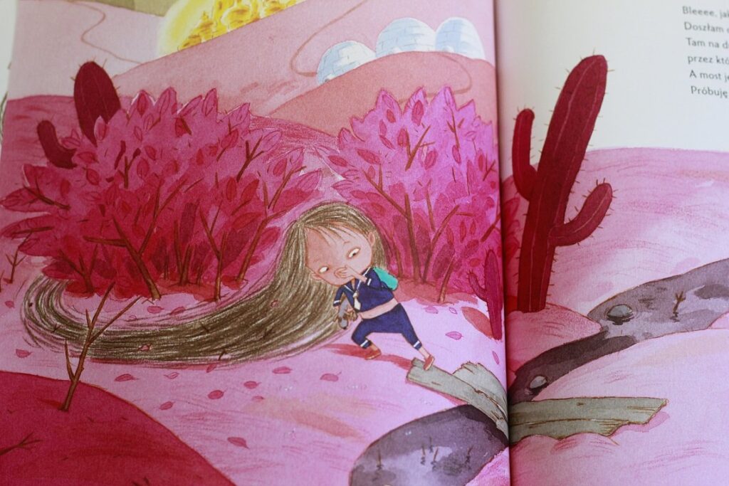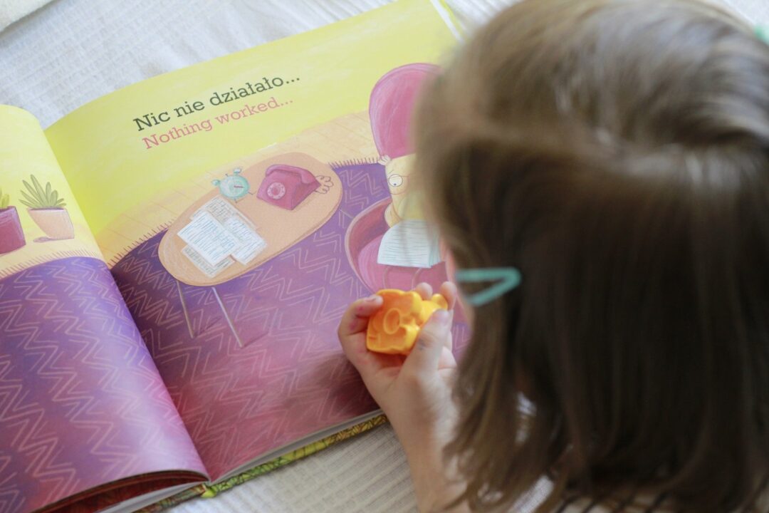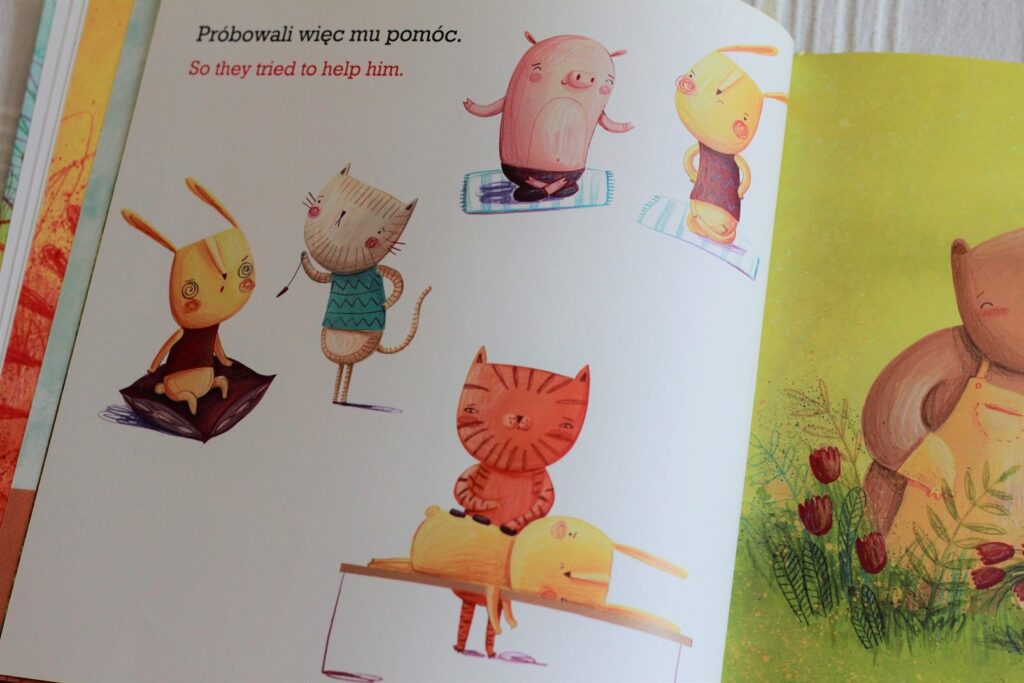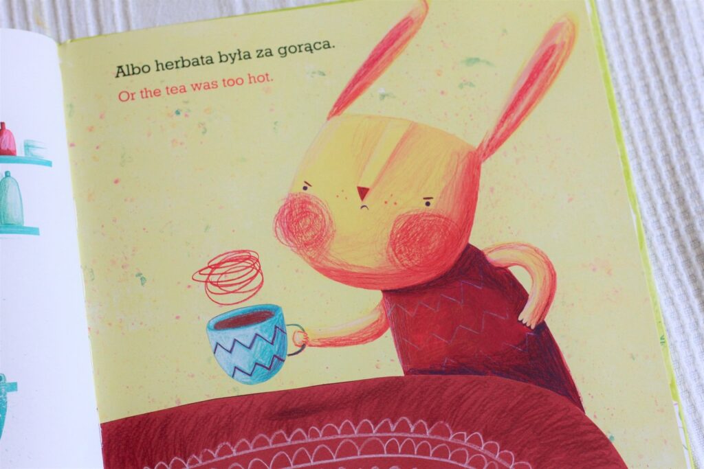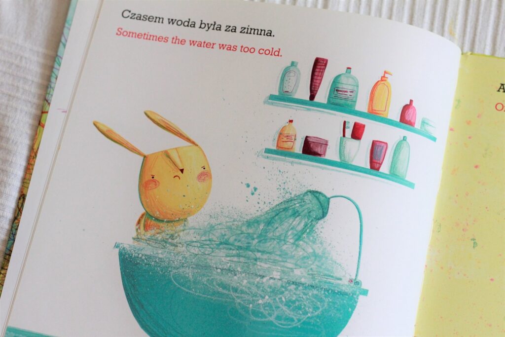 Bardzo podoba mi się nie tylko tematyka, ale też fakt, że nie wszystko jest napisane, książka zachęca do interakcji – rodzica do opowiadania i dziecko do zadawania pytań. Poza tym jest dwujęzyczna, dzięki czemu możemy oswajać dziecko z angielskim i urozmaicać lekturę. Tekstu jest niewiele i jest prosty, więc myślę, że książka spokojnie się nada nawet dla 2-letnich maluchów.