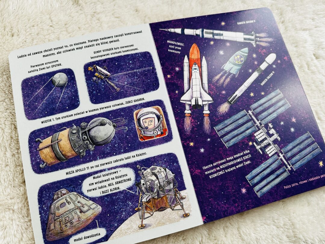 Wspaniała książka z kartonowymi stronami dla młodszych pasjonatów Kosmosu i klimatów pozaziemskich :) Dzieci dowiedzą się z niej najważniejszych faktów o Wszechświecie, Układzie Słonecznym, fazach Księżyca i misjach kosmicznych. Zbudujemy własną rakietę, sprawdzimy, jakie przeszkolenie musi przejść przyszły astronauta i jak wygląda codzienność na stacji kosmicznej. Każda strona opatrzona jest ciekawostkami, zadaniami i pięknymi ilustracjami.
