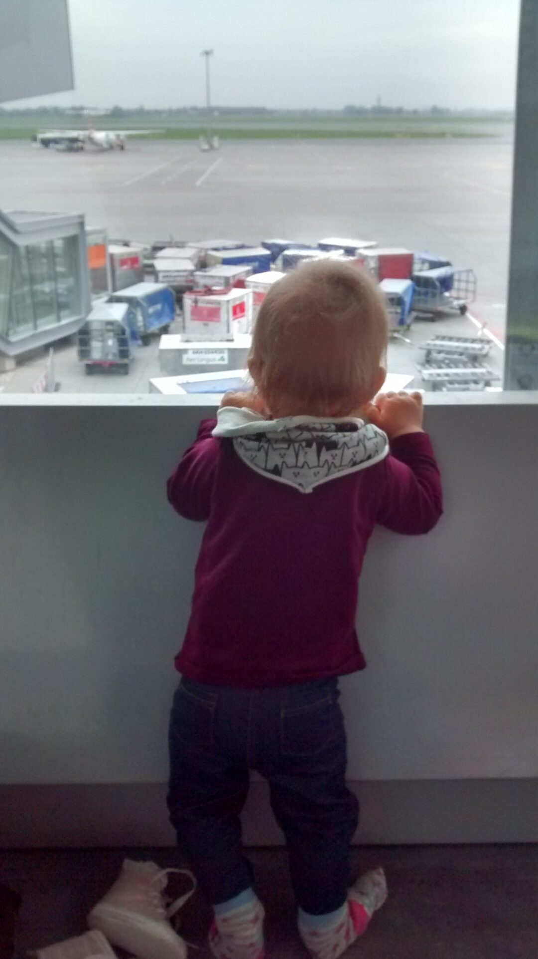 A teraz Wam opowiem jak przebiegł lot i co się sprawdziło. Przede wszystkim wylatywalismy o dogodnej godzinie – 8:30, w związku z czym musieliśmy wcześnie zerwać Tosię z łóżka. Na lotnisku była tak zaaferowana nowym miejscem i ludźmi, że nie zasnęła. Podczas startu zaczęłam ją karmić, żeby jej się uszy nie zatykaly i… tak, właśnie tak! Zasnęła :) Spała 1,5 godziny. Została nam więc tylko godzina zabawiania. Co się okazało hitem, jak myślicie? Książeczka? Nowa grzechotka? Rzodkiewki? Skądże! Najwiecej radości sprawiła Tosi zabawa dwoma pustymi kubeczkami po wodzie, którą otrzymaliśmy na pokładzie. Na drugim miejscu była zabawa w zamykanie i otwieranie stoliczka, na trzecim „a kuku” pod mamy kapeluszem. Dziecięca wyobraźnia nie zna granic :) Problematyczne okazało się jedynie lądowanie, Nie dość, że nie mogła do woli wstawać na moich kolanach i przemieszczać się nieustannie od mamy do taty i z powrotem, to jeszcze Tosiowe uszka się zatykały, bo nie chciała pić mleczka ani herbatki. Było trochę krzyku, ale łezka żadna nie poleciała, a to dzięki połączonym wysiłkom rodziców i przemiłej pani, która siedziała obok mnie i miała niesamowicie interesujący futerał na okulary.