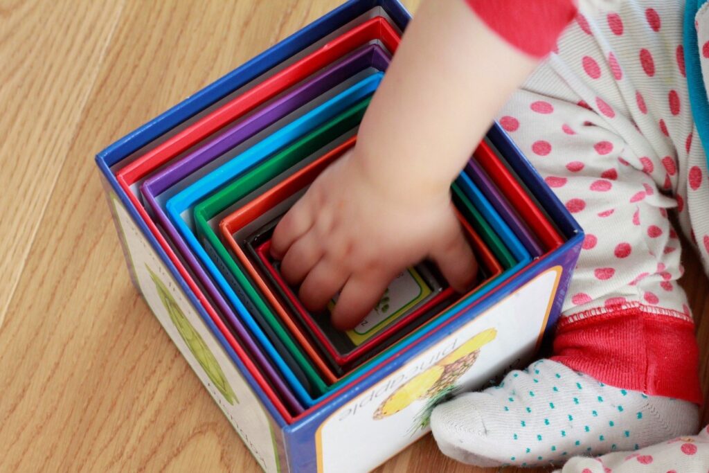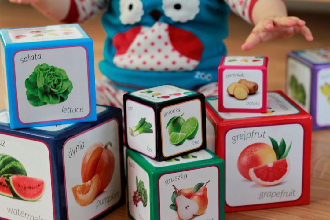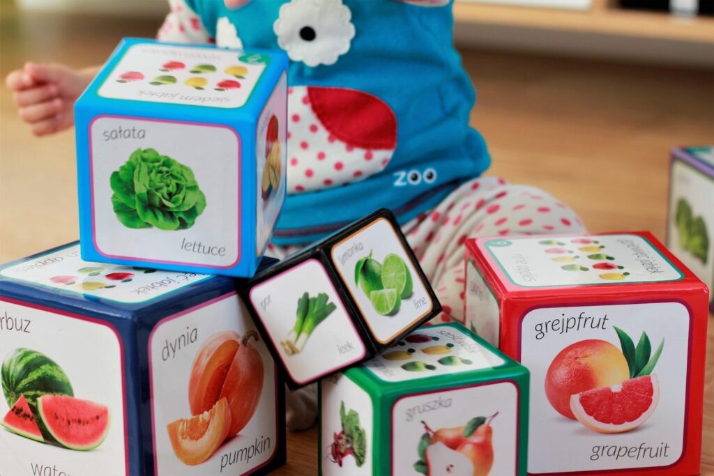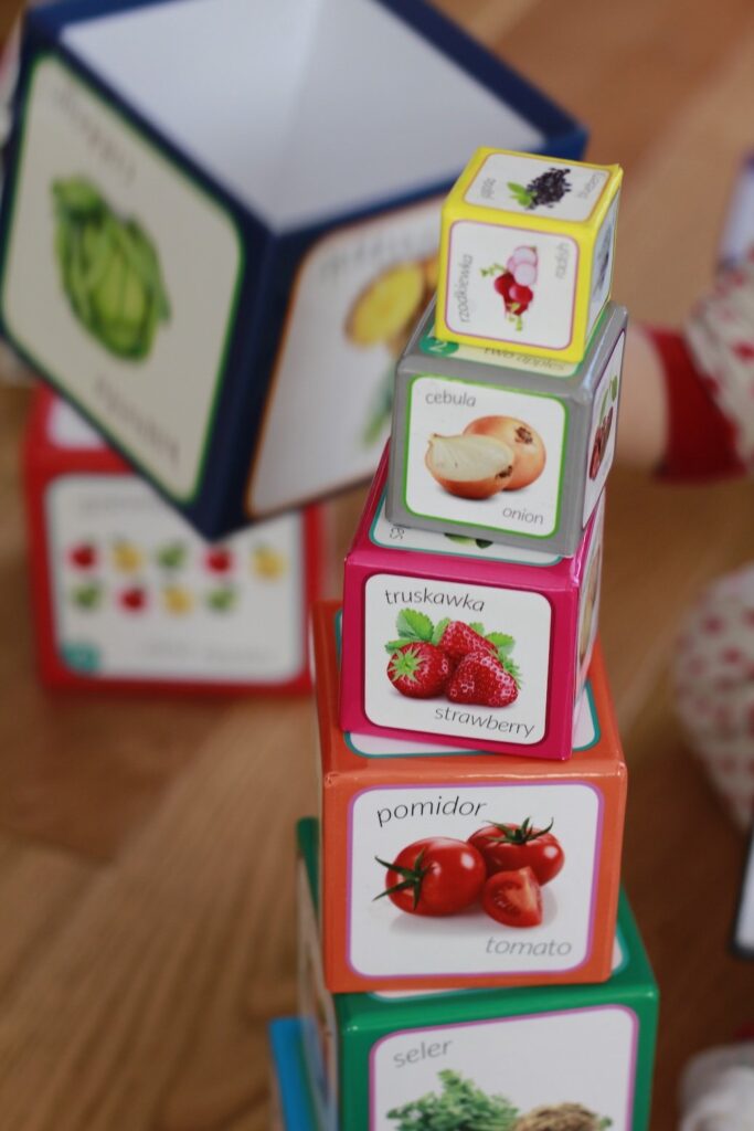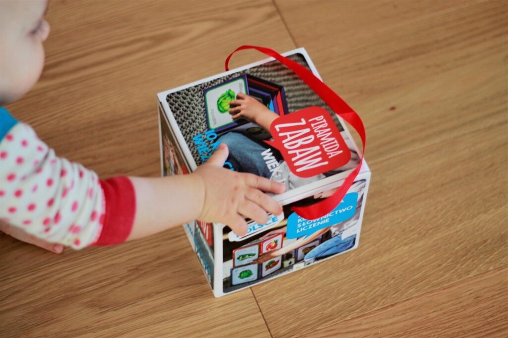 Taką zabawką jest zestaw kartonowych pudełek z realnymi obrazkami warzyw i owoców Piramida Zabaw. Helenka bawi się nimi praktycznie codziennie, nierzadko wspólnie ze starszą siostrą. Pudełka można układać jedno na drugim, szeregować, liczyć, wkładać jedno w drugie, porównywać wielkościami, poznawać owoce i warzywa, zarówno po polsku, jak i po angielsku. Ułożoną z nich wieżę można też bezkarnie burzyć, bo są bardzo solidnie wykonane i nawet wielu tygodniach intensywnej zabawy wyglądają jak nowe.