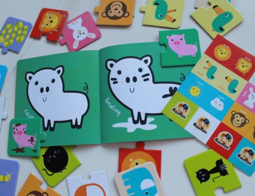 Na serię „Moje pierwsze słowa” składają się zestawy „W domu”, „Kształty i kolory”,„Zwierzęta” oraz „Owoce i warzywa”. Świetne są też karty z napisami po angielsku.