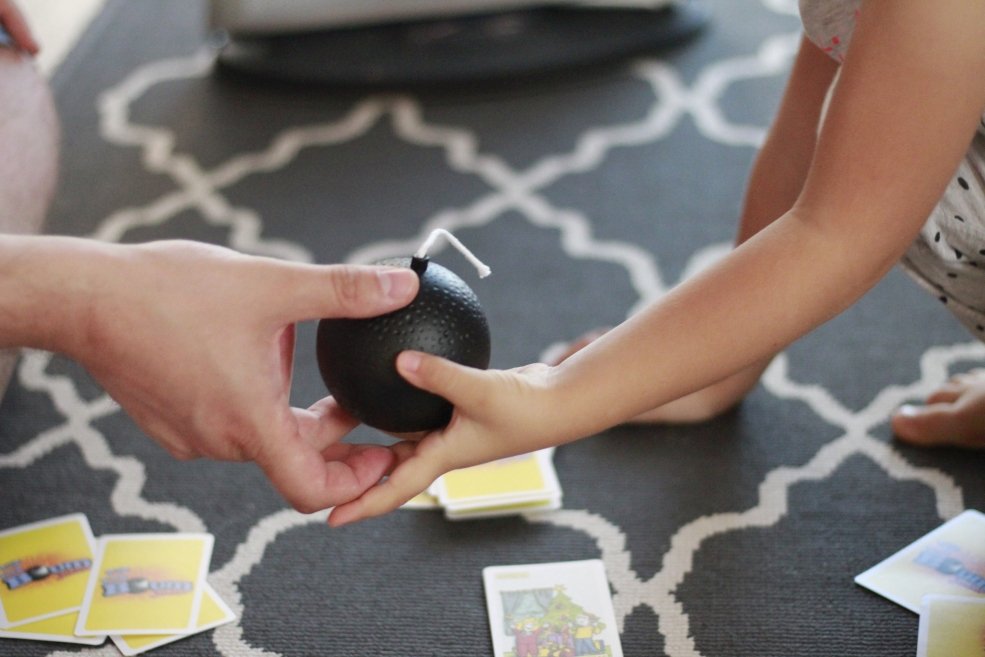 W pudełku znajdziemy 110 kart i… bombę, która jest tutaj najważniejsza i stanowi największą atrakcję dla dzieci. Podczas rozgrywki gracze mają za zadanie wypowiadanie słów, które im się kojarzą z obrazkiem na karcie. Robią to po kolei, wymieniając się bombą, aż skończy się czas, czyli bomba wybuchnie :) Gracz, który trzymał ją wtedy w rękach zatrzymuje kartę. Gra kończy się, gdy jeden z graczy zbierze 5 kart lub w dowolnym innym momencie. Dzięki temu rozgrywka może trwać zarówno kilka minut jak i znacznie dłużej. To bardzo pomocne w przypadku małych dzieci, które mają 100 pomysłów na minutę.
